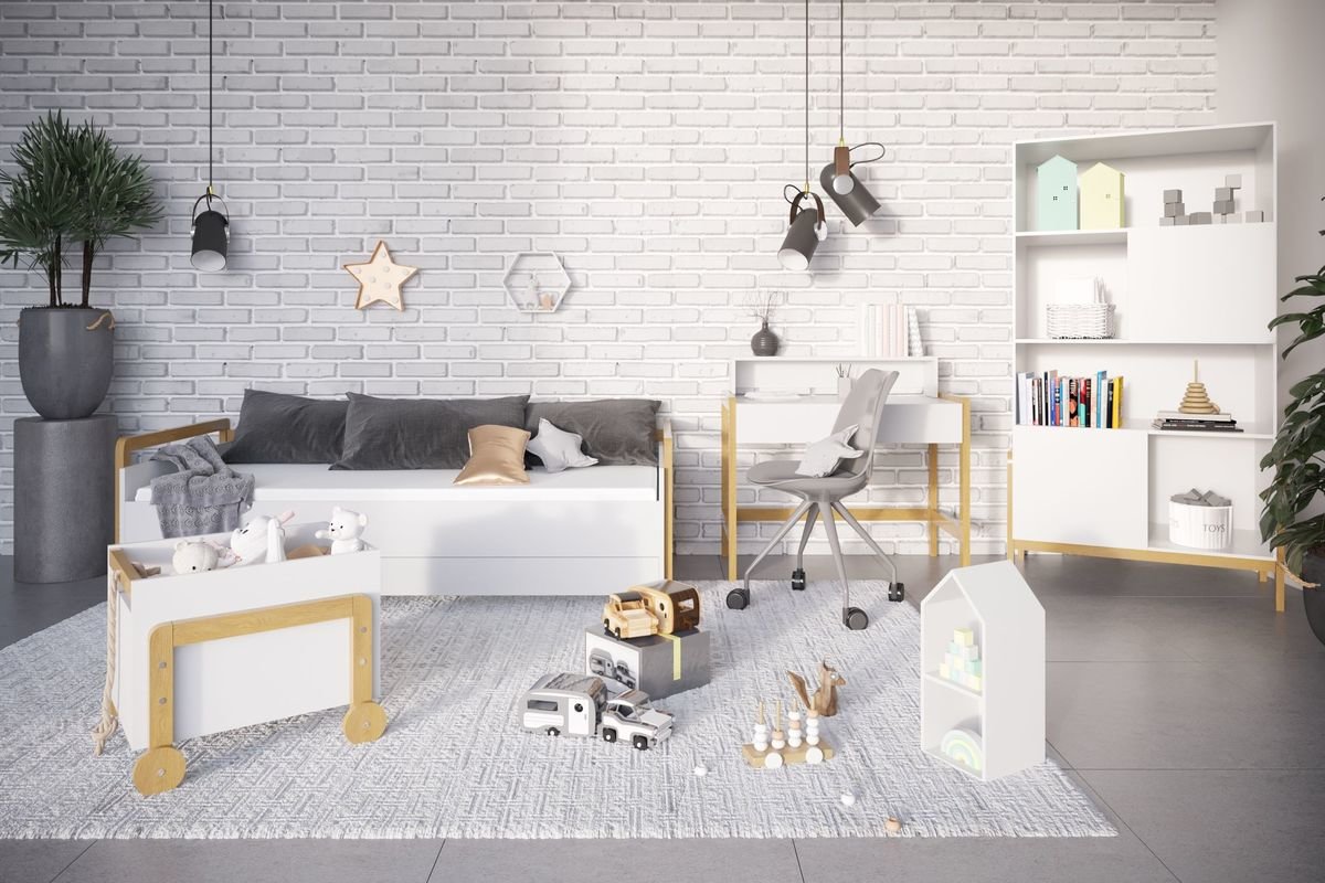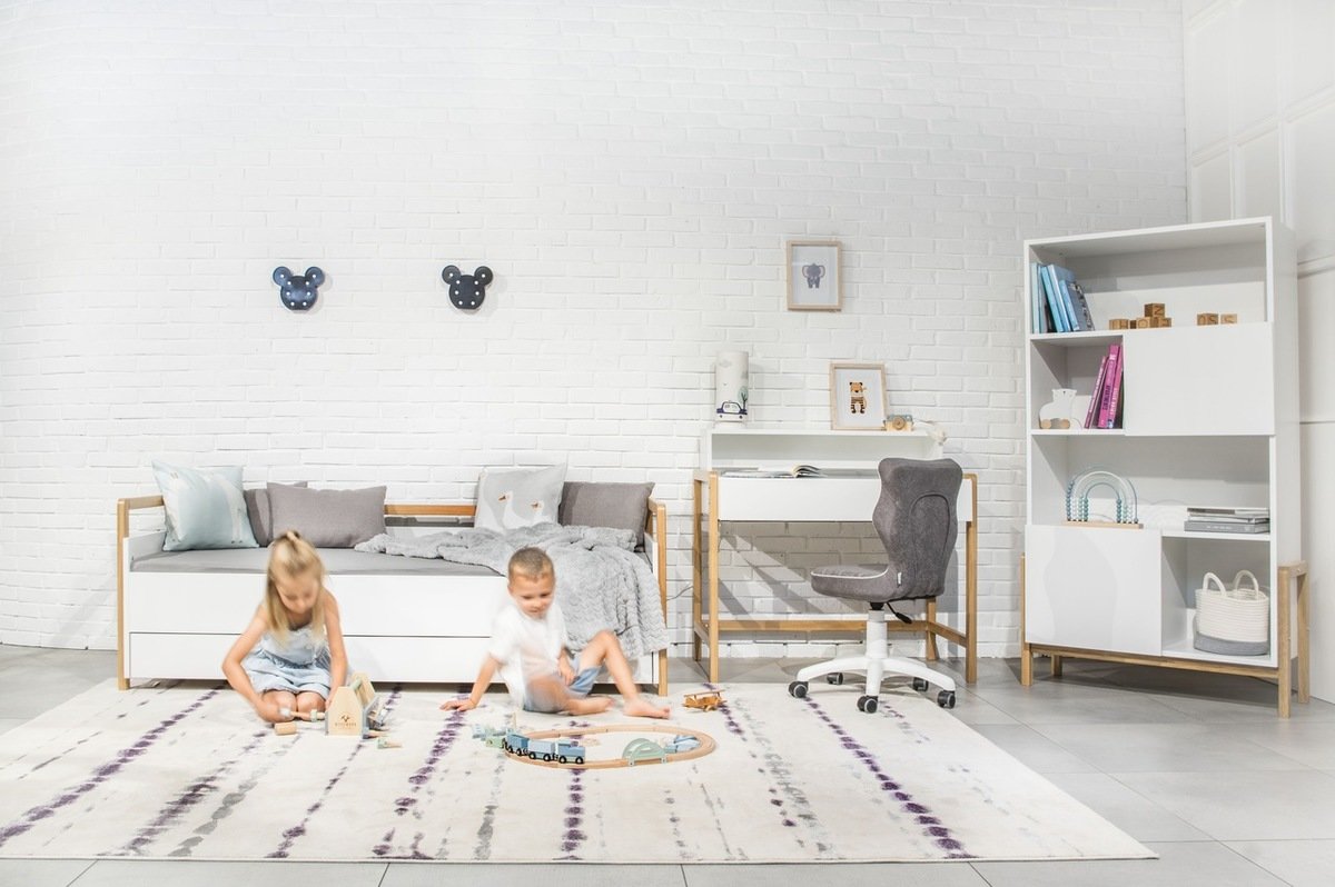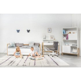 Dziecięce łóżko z oparciem Viktor w stylu skandynawskim doda uroku każdemu pokojowi. Białe łóżko z drewnianymi elementami o wymiarach 180 x 80 cm w nocy służy jako klasyczne łóżko, a w ciągu dnia jako sofa dla gości lub przytulny kącik do zabawy.
