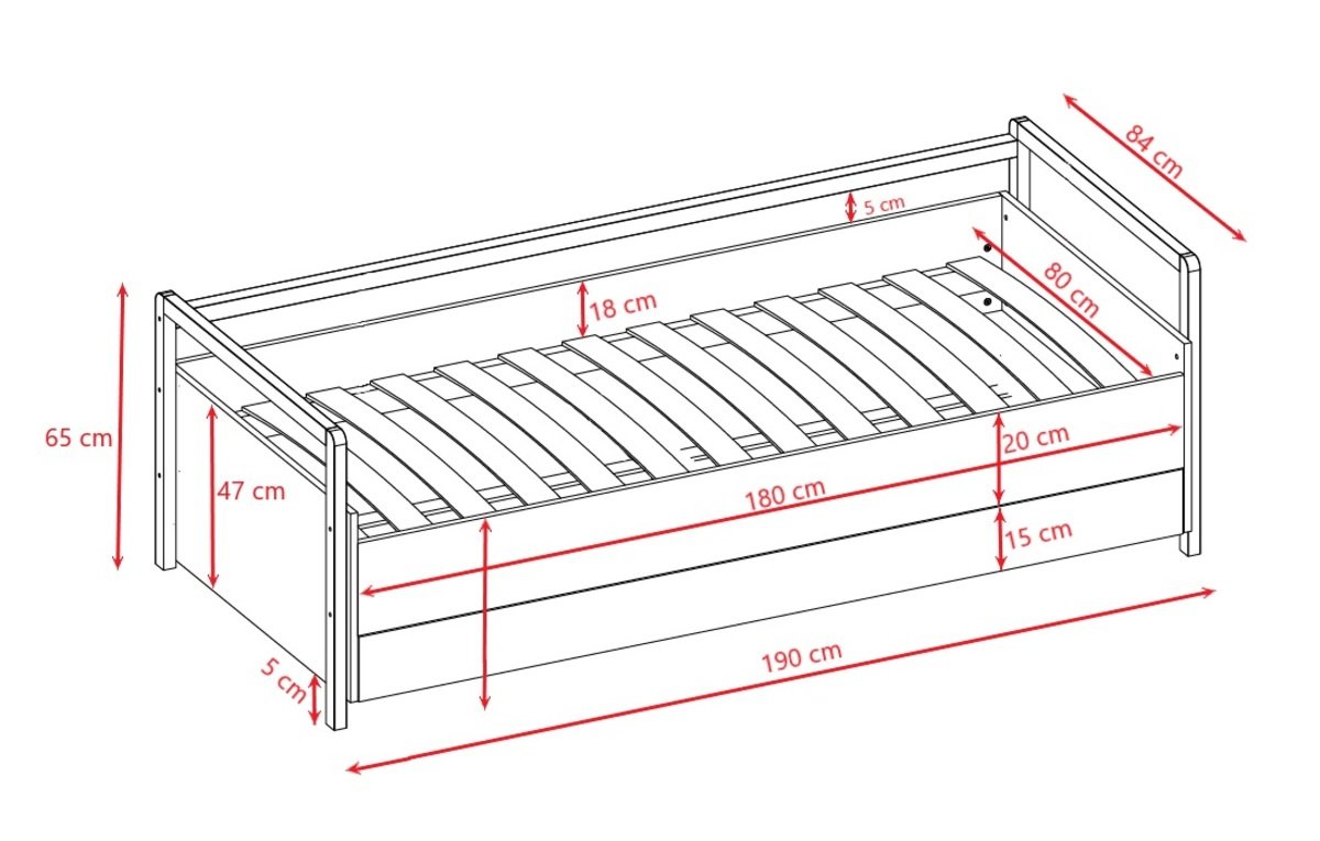 Uwaga: Materac nie jest częścią łóżka. Wybierz materac o wymiarach 180 x 80 cm w kategorii materace dziecięce.