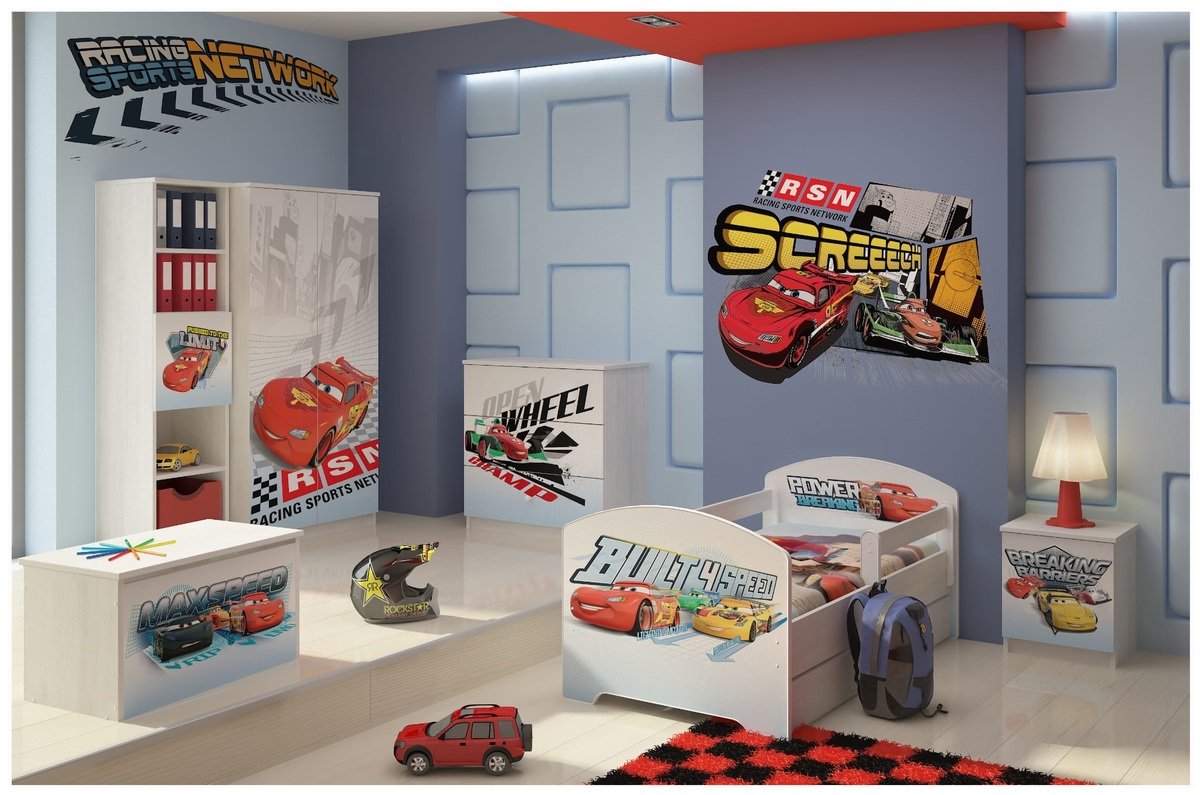 Łóżko dziecięce z bohaterami filmu Cars 2 autorstwa Pixar. Zdjęcie pokazuje czerwony samochód błyskowy McQueen, żółty Miguel Camino i zielono-niebieską Carla Veloso. Łóżeczko wykonane jest z laminatu. Wszystkie krawędzie są gumowane i zaokrąglone, aby zapewnić dzieciom bezpieczeństwo. Łóżko pasuje do pokoju chłopców.