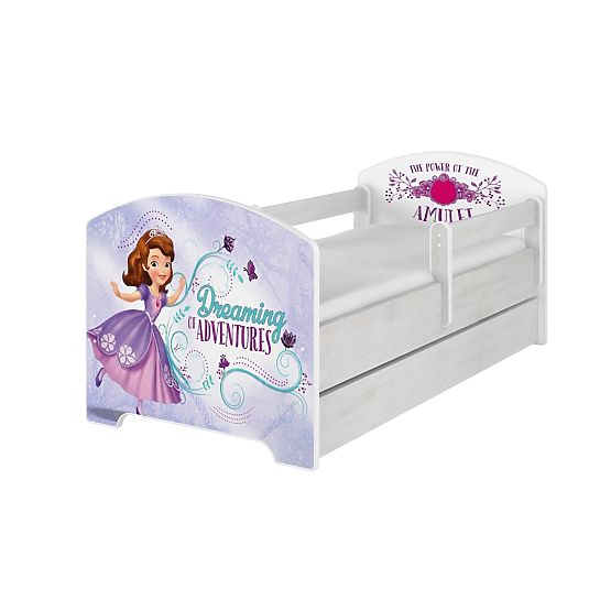 Białe łóżko dziecięce z barierką bezpieczeństwa z motywem księżniczki Disneya Zosi pierwszej. W skład łóżka wchodzą dwie barierki i stelaż z litego drewna sosnowego.