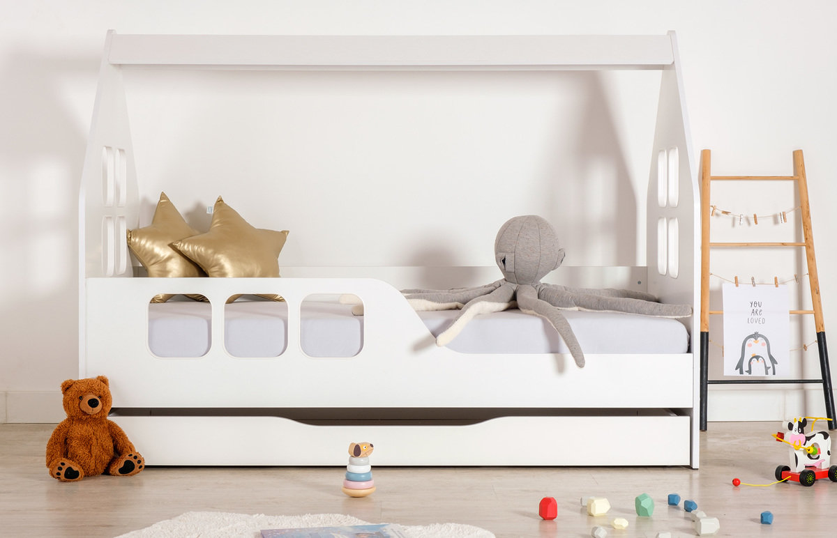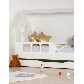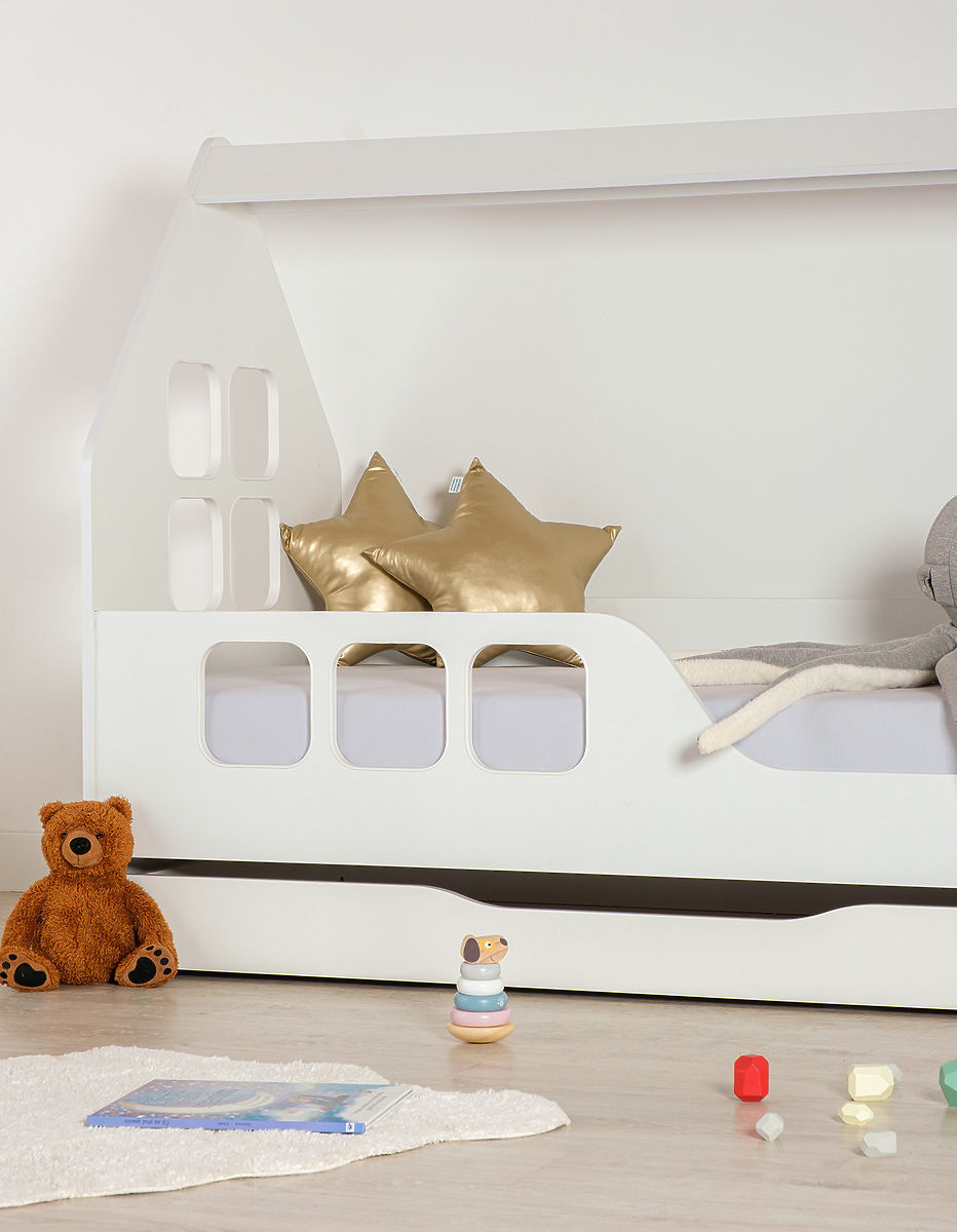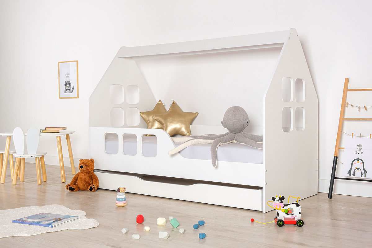 Białe łóżko Woody w kształcie domku z oknami o wymiarach 160 x 80 cm. To oryginalne wykonanie łóżka w kształcie domku stanie się piękną dominantą pokoju dziecięcego. W ciągu dnia spełni funkcję przytulnego kącika, a w nocy stworzy bezpieczne miejsce do spania.