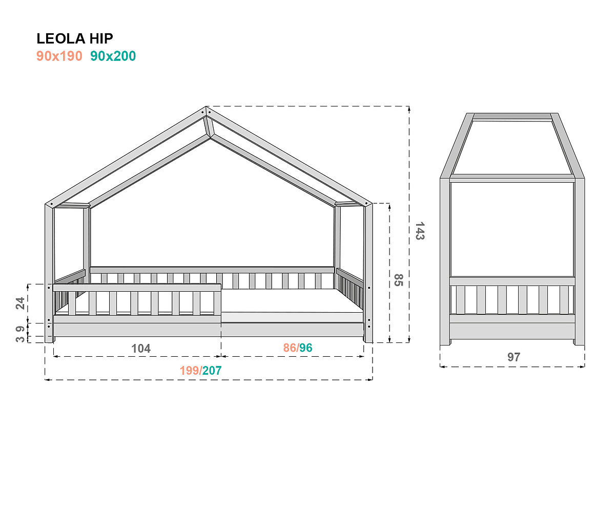 Łóżko o wymiarach 190 × 90 cm zawiera dodatkowe nóżki o wysokości 17 cm.