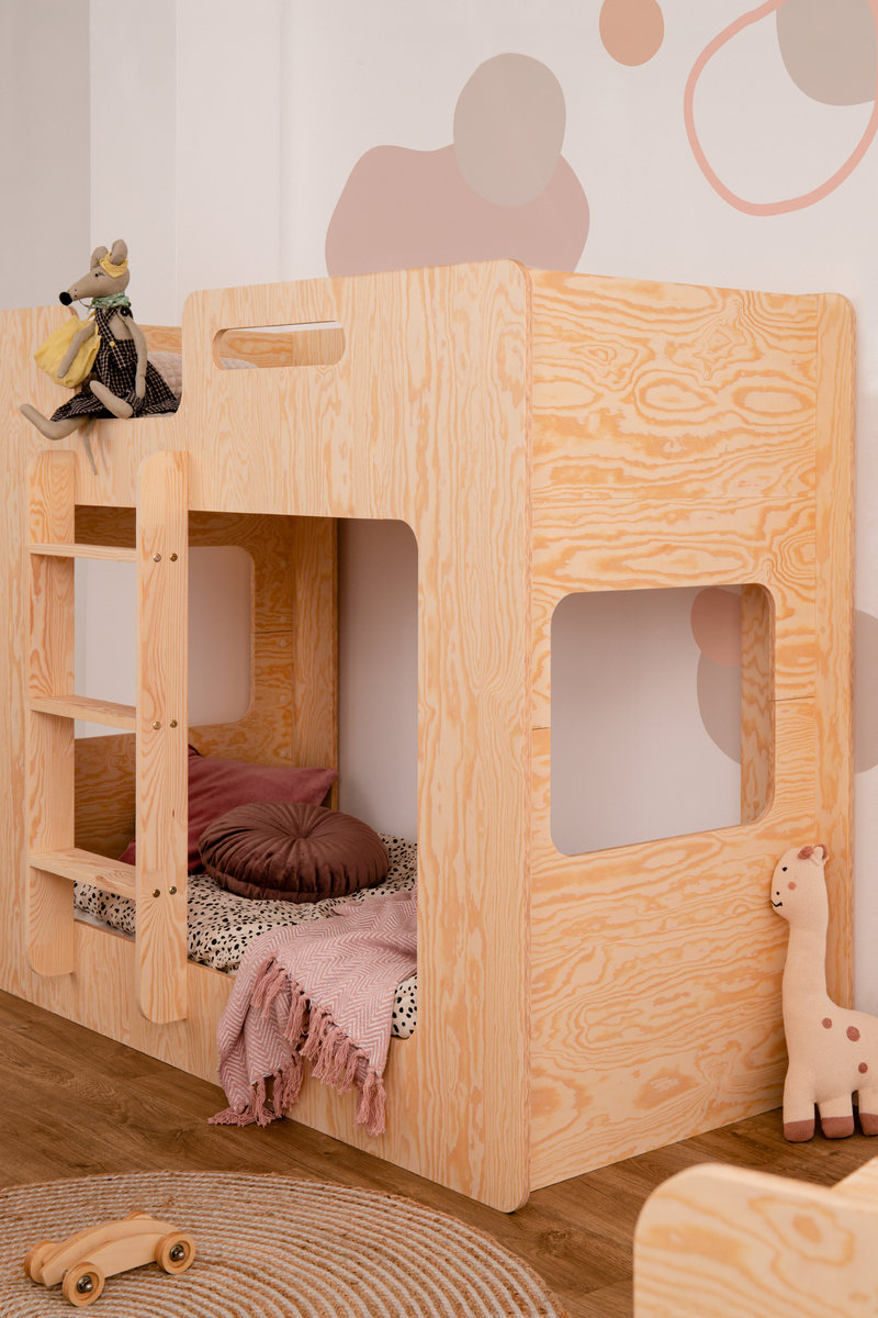 Łóżko piętrowe Leo będzie wyjątkową dominantą pokoju dziecięcego. Dzięki swojemu designowi i naturalnemu kolorowi pasuje zarówno do pokoju chłopców, jak i dziewcząt. Można je łączyć z różnokolorowymi dodatkami. Charakteryzuje się niecodziennym, nowoczesnym designem, który od razu przyciąga uwagę odwiedzających pokój. Łóżko piętrowe Leo będzie ulubionym miejscem odpoczynku i zabawy dla Twoich dzieci.