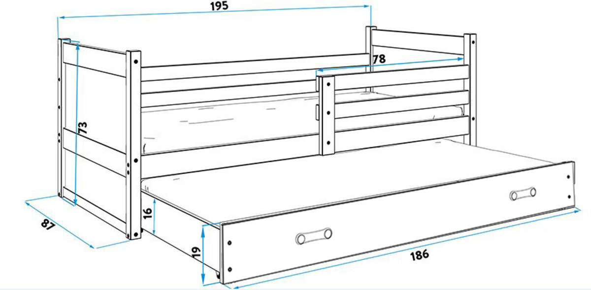 | Dodatkowe cechy łóżka: | z barierką, z szufladą, z materace i rusztem, z materacem, z rusztem, z dostawką, bez nadruku |