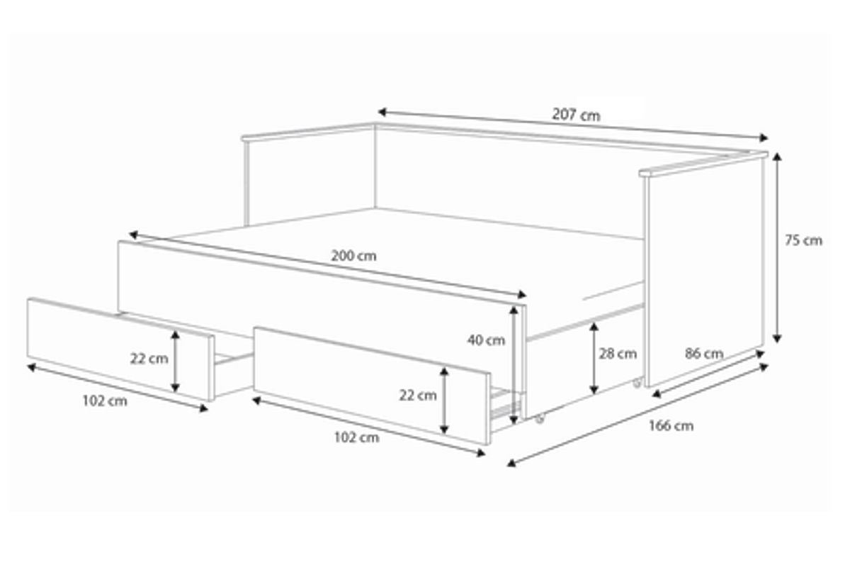 Model HELIOS to nie tylko wygodne miejsce do spania, ale także praktyczne rozwiązanie do codziennego użytku. Dzięki przestronnym szufladom na prowadnicach kulkowych, przechowywanie pościeli, ubrań czy drobiazgów jest bardzo łatwe, co pozwala utrzymać porządek w pokoju. Po złożeniu łóżko służy jako elegancka i wygodna sofa, idealna do relaksu w ciągu dnia lub przyjmowania gości. Solidna konstrukcja z wysokiej jakości płyty meblowej o grubości 18 mm zapewnia trwałość i stabilność, podczas gdy brzozowe listwy stelaża dbają o odpowiednie podparcie materaca, gwarantując komfortowy sen każdej nocy.