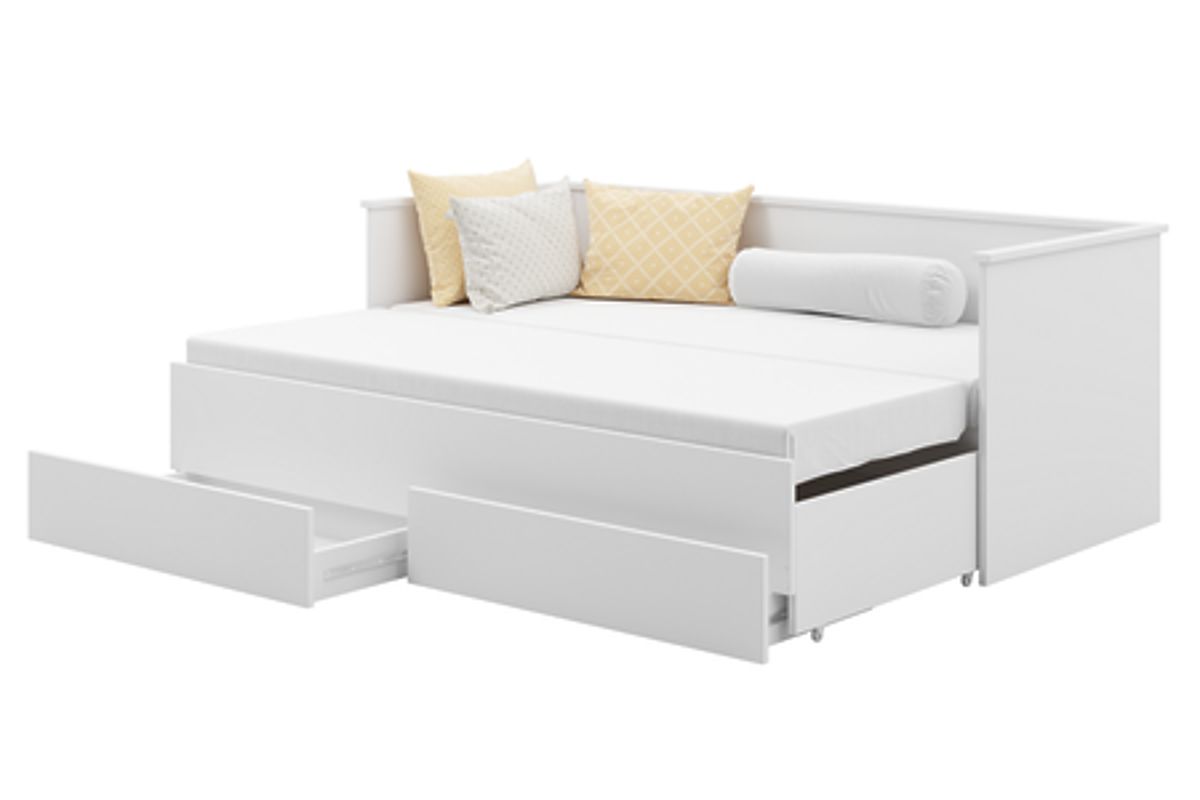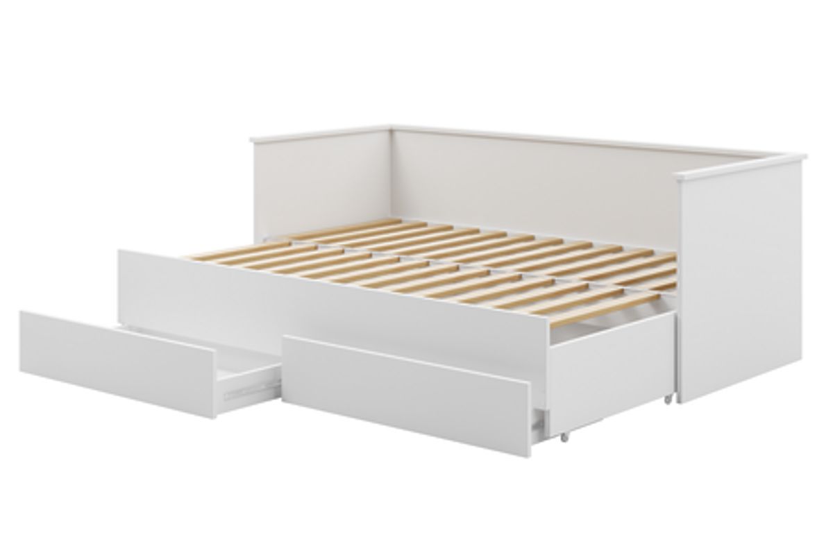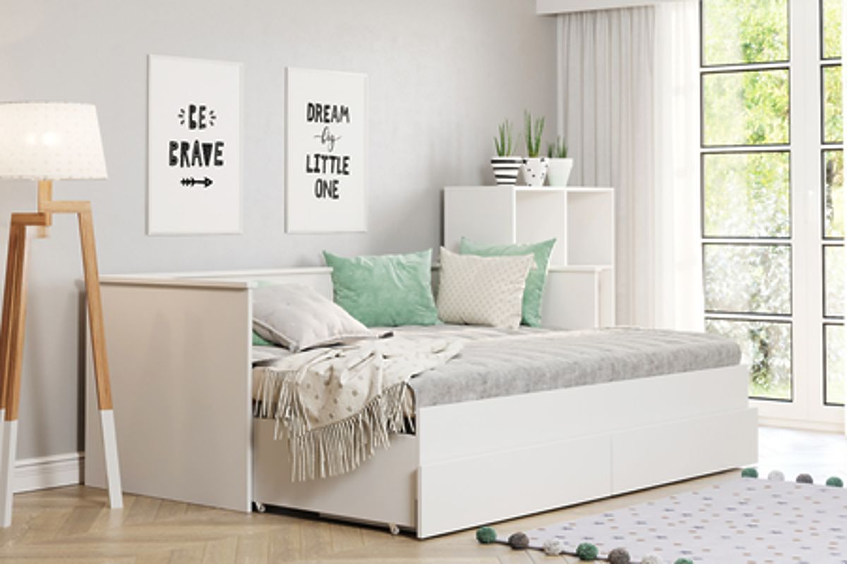 Łóżko HELIOS to nowoczesne, rozkładane łóżko dla młodzieży, które łączy elegancki wygląd z praktycznymi funkcjami. Dzięki możliwości szybkiego rozłożenia na podwójne łóżko, poprzez wysunięcie dolnej podstawy, mebel ten doskonale nadaje się zarówno do małych, jak i przestronnych pokoi. Jego uniwersalny design w białym kolorze pasuje do każdego stylu wnętrza, nadając mu nowoczesny charakter i subtelną elegancję.