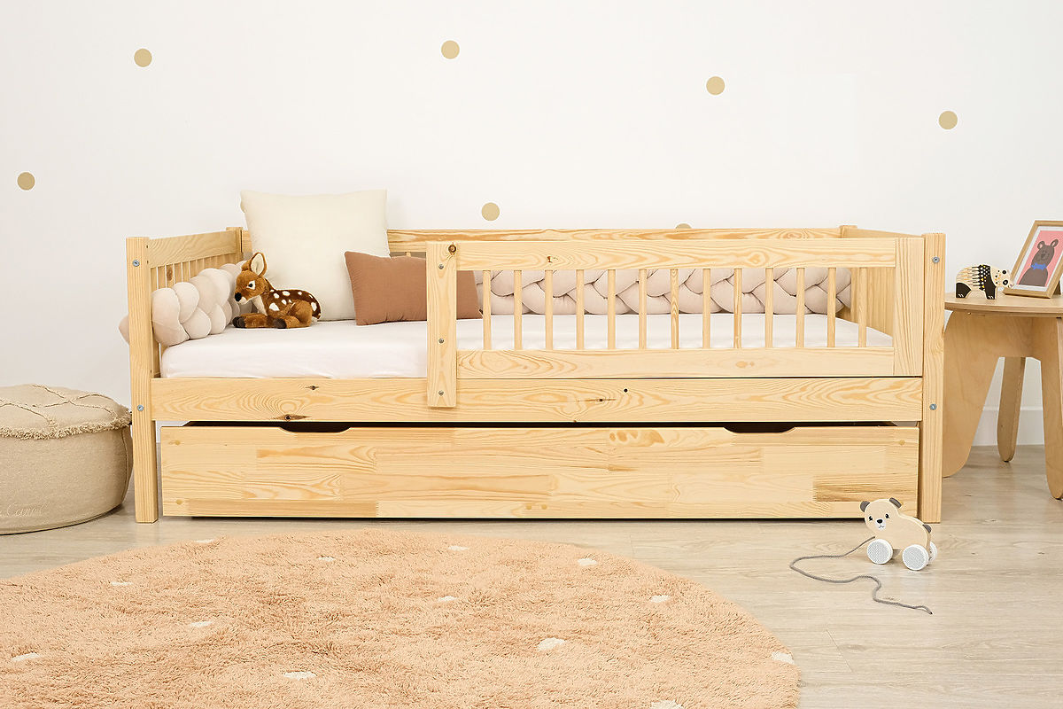 Nowoczesne łóżko dziecięce Teddy Plus w naturalnym kolorze doskonale wpasuje się w każdy dziecięcy pokój. To łóżko z boczną barierką zapewnia dzieciom bezpieczne i wygodne miejsce do zabawy, odpoczynku w ciągu dnia oraz nocnego snu. Minimalistyczny design i użycie wysokiej jakości naturalnych materiałów (drewna sosnowego) sprawiają, że pokój dziecięcy staje się estetycznie przyjemny i tworzy harmonijną przestrzeń dla naturalnego rozwoju dzieci.