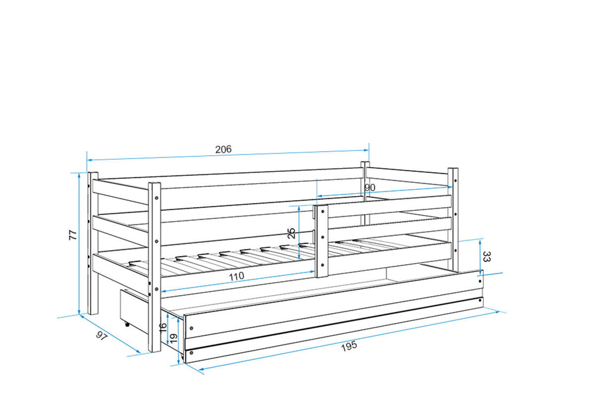| Dodatkowe cechy łóżka: | z barierką, z szufladą, z materace i rusztem, z materacem, z rusztem, bez nadruku |