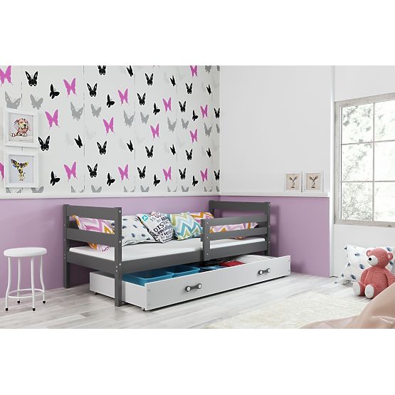 Pojedyncze szaro-białe łóżko dziecięce Erik z szufladą i drążkiem bezpieczeństwa. Funkcje: - bariera jest uniwersalna, podczas montażu decydujesz, po której .. więcej