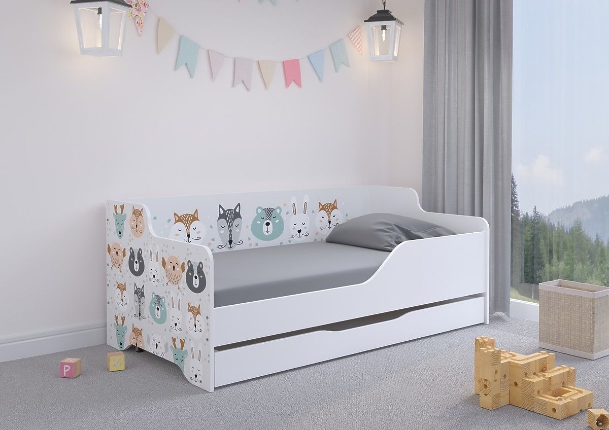 Łóżko dziecięce Lilu w kształcie kanapy z nadrukiem leśnych zwierząt. .. więcej