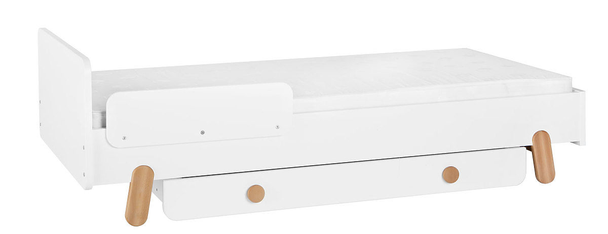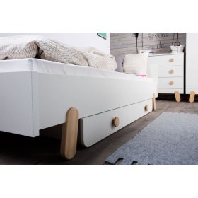 Do łóżka można dokupić boczną barierkę i pojemnik na pościel.