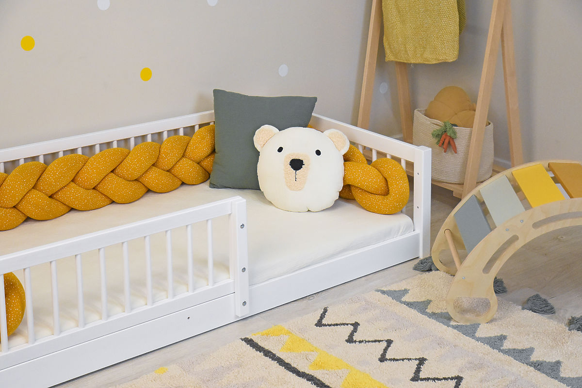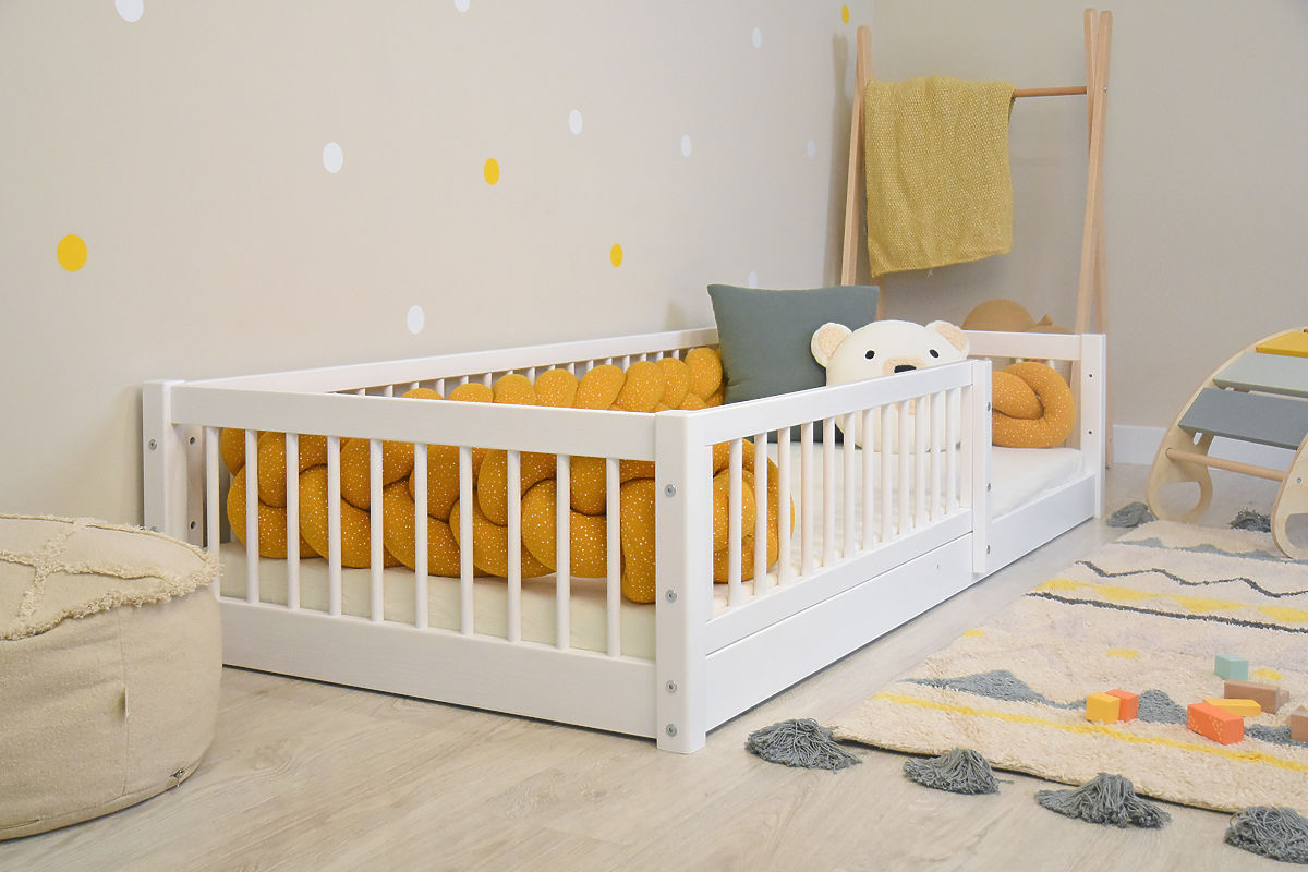 Łóżko Montessori w eleganckim białym kolorze zostało zaprojektowane z myślą o potrzebach małych dzieci i zasadach pedagogiki Montessori. Dzięki niskiej konstrukcji umożliwia dziecku samodzielny i bezpieczny dostęp do łóżka bez pomocy dorosłych, co wspiera jego niezależność i pewność siebie.