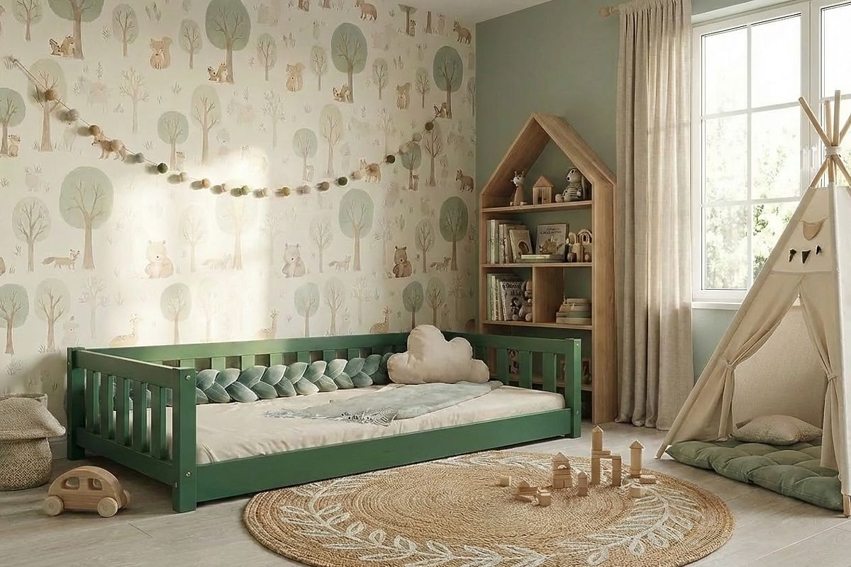Nowoczesne łóżko dziecięce Montessori Meadow w zielonym kolorze, zaprojektowane zgodnie z podstawowymi zasadami Montessori, przyciągnie uwagę wszystkich rodziców, którzy chcą wspierać samodzielność i niezależność swoich dzieci. To niskie łóżko z barierką oferuje bezpieczne i wygodne środowisko do zabawy, odpoczynku w ciągu dnia i snu nocnego. Ponadczasowy design i użycie drewna sosnowego sprawiają, że każde dziecięce pokoje wyglądają estetycznie przyjemnie i tworzą harmonijną przestrzeń dla naturalnego rozwoju dzieci.