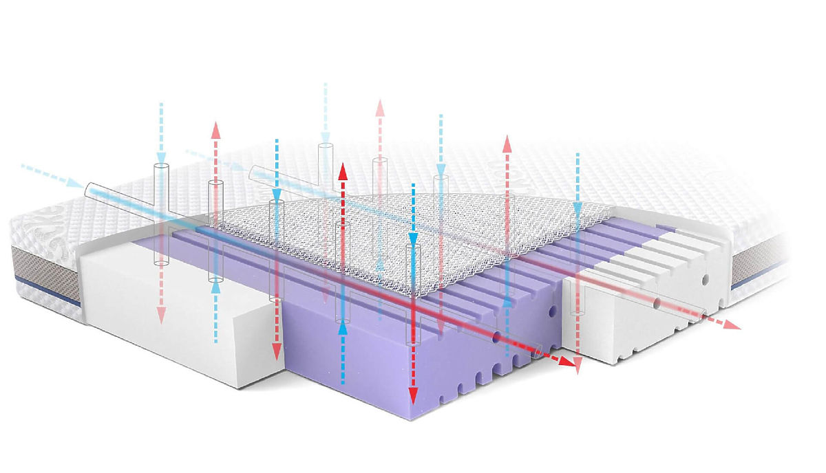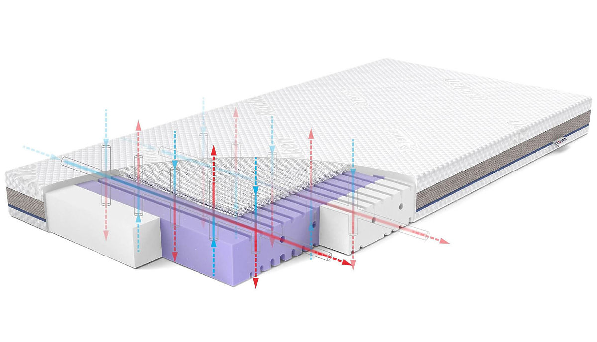 • Liczne poziome kanaliki wentylacyjne znajdujące się na obu powierzchniach do spania są zintegrowane z pionowymi kanalikami przechodzącymi przez grubość materaca oraz kanalikami wyciętymi wewnątrz wkładu. Taka budowa umożliwia swobodny napływ powietrza do środka materacyka dziecięcego, przez siatkę napowietrzającą 3D wszytą na całym obwodzie pokrowca