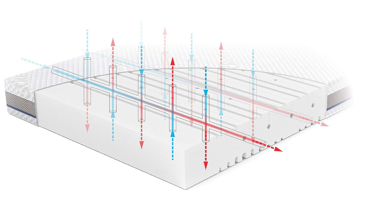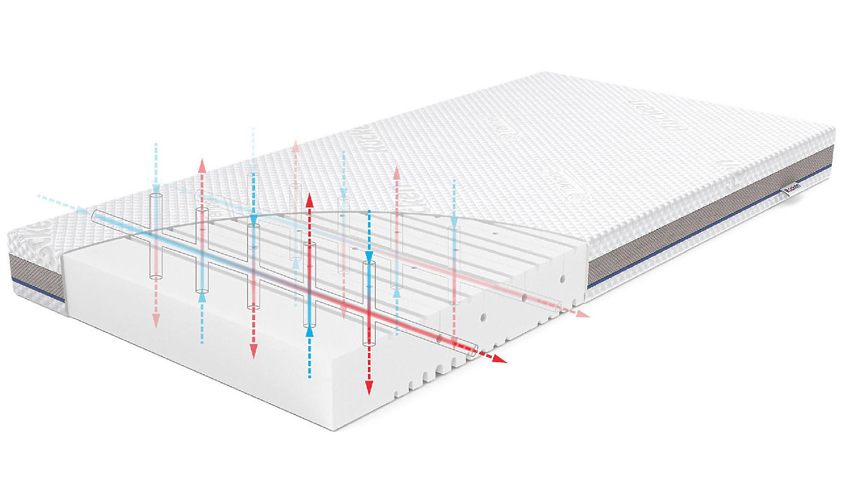 Po całym obwodzie materaca wszyliśmy siatkę wentylacyjną, która współpracuje z kanałami powietrznymi materaca.