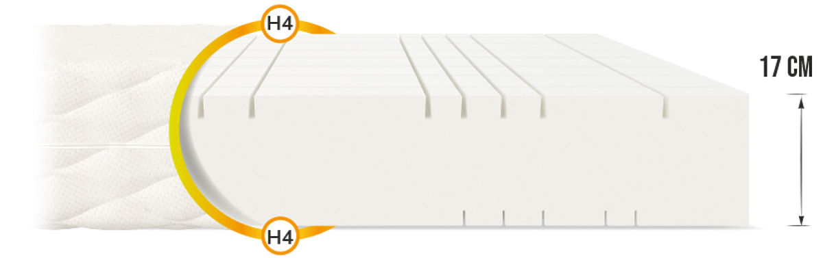 GOYA to uniwersalny materac piankowy o wysokości 17 cm , który zapewni jakość snu całej rodzinie. Jego konstrukcja jest prosta, bo wycięta z jednego kawałka pianki, a mimo to posiada wiele zalet. Materac dwustronny podzielony jest na 7 stref dzięki szeregowi nacięć wzdłużnych i poprzecznych. Prowadzi to do znacznego wzrostu plastyczności, co zapewnia doskonałe podparcie kręgosłupa , dzięki czemu obudzisz się wypoczęty i pełen energii.