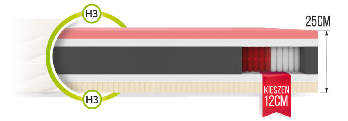 Po jednej stronie materaca znajduje się warstwa lateksu , który jest bardzo elastyczny , co poprawia komfort, a dzięki perforowanej strukturze doskonale przepuszcza powietrze . Kolejną warstwę stanowi pianka T25 pur , której zaletami są wysoka odporność na odkształcenia, elastyczność, oddychalność oraz stabilizacja ciała podczas odpoczynku. Pomiędzy sprężyny a piankę T25 pur wprowadzono materiał oddzielający . To naturalny filc, który może znacznie przedłużyć żywotność materaca i wzmocnić jego konstrukcję. Komfort snu niesamowicie podnosi pianka termoplastyczna VISCO , która znajduje się po drugiej stronie materaca. Dzięki wpływowi temperatury i masy ciała doskonale odwzorowuje naturalne kształty ciała , co zapewnia prawidłowe podparcie całej sylwetki. VISCO i sprężyny są ponownie oddzielone warstwą trwałej pianki T25 pur i naturalnego materiału oddzielającego.
