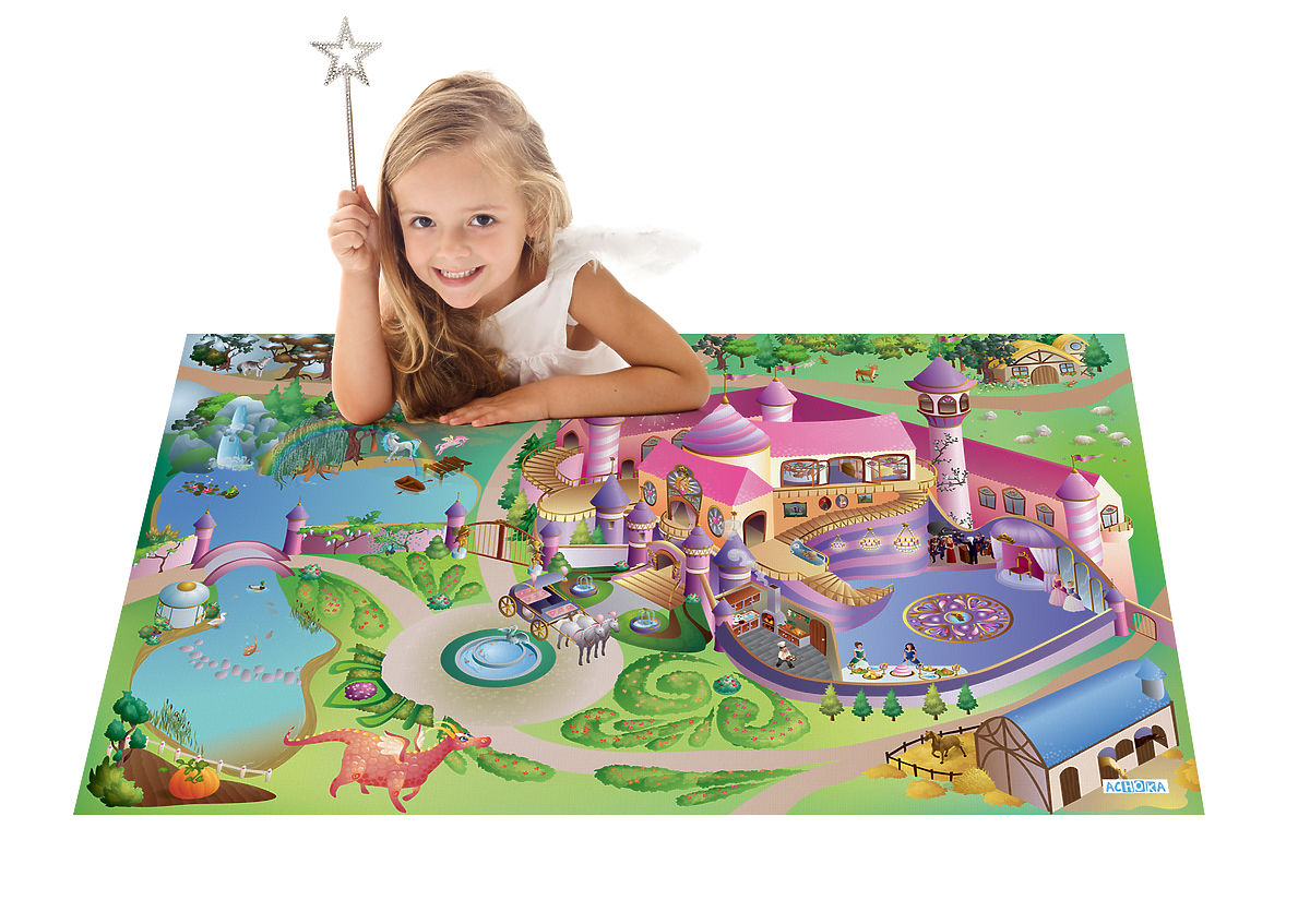 Dziecięca mata do zabawy w rozmiarze 100x150 cm z imitacją 3D. Podkładka pokazuje zamek księżniczkom i przyciąga wszystkie dzieci do zabawy.