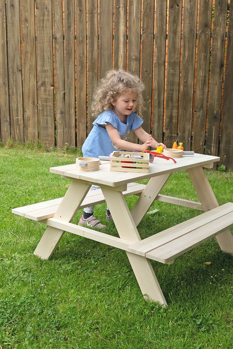 To jest mini wersja ogrodowego stołu piknikowego dla dzieci. Zestaw wykonany jest z wysokiej jakości drewna sosnowego. Ten stół piknikowy będzie niezastąpiony dla twoich dzieci w ogrodzie i zapewni im mnóstwo zabawy z przyjaciółmi.