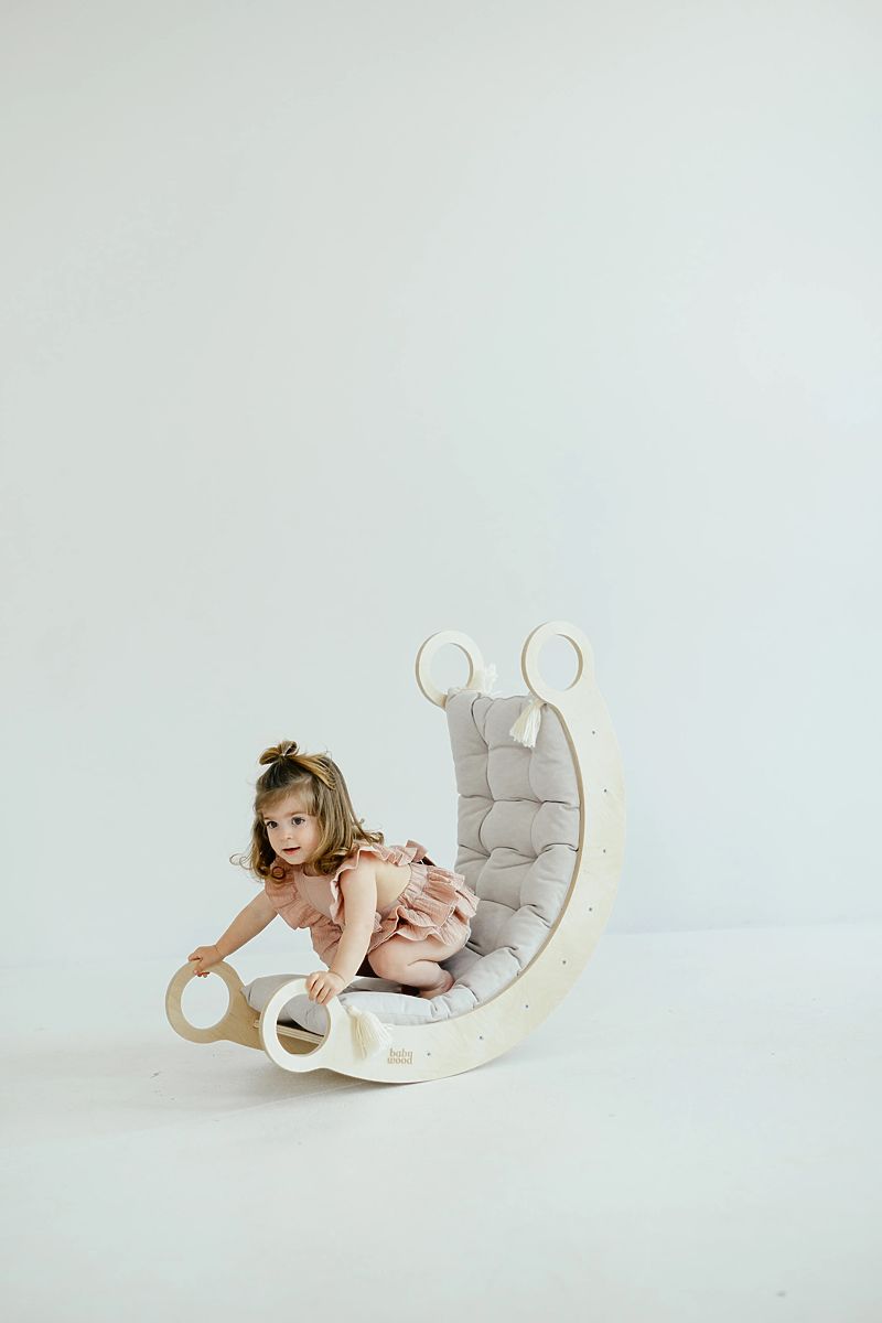Spraw swojemu dziecku fotel bujany, który rośnie razem z nim! Drewniany fotel bujany Montessori to doskonały towarzysz na długie godziny zabawy i nauki. Służy nie tylko do bujania i rozwijania zmysłu równowagi, ale także jako wielofunkcyjny element do kreatywnej zabawy – w mgnieniu oka zamienia się w stoisko sklepowe, kryjówkę lub statek płynący po morzu. Wyobraźnia nie zna granic!