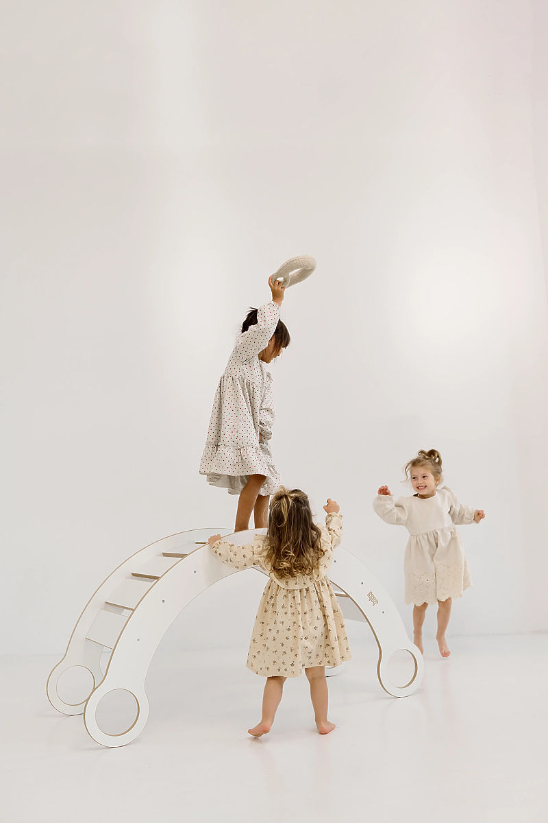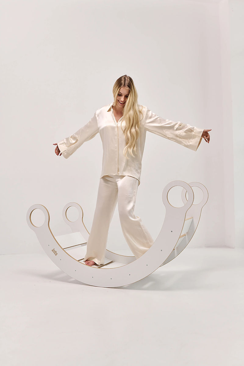 Stylowa drewniana huśtawka Montessori XL w białym kolorze doskonale pasuje do dziecięcych pokoi lub sal zabaw. Ten wielofunkcyjny zestaw umożliwia bezpieczne huśtanie się oraz kreatywne zabawy – może służyć jako tajna kryjówka, mały stolik lub przestrzeń do budowania. Naturalnie wspiera rozwój siły, równowagi i umiejętności motorycznych dzieci. Huśtawka Montessori XL jest solidna i trwała dzięki wysokiej jakości drewnu. Jej elegancki i ponadczasowy design łatwo wpasowuje się w każde wnętrze, zapewniając dzieciom godziny zabawy przy rozwijaniu zdolności fizycznych i psychomotorycznych.