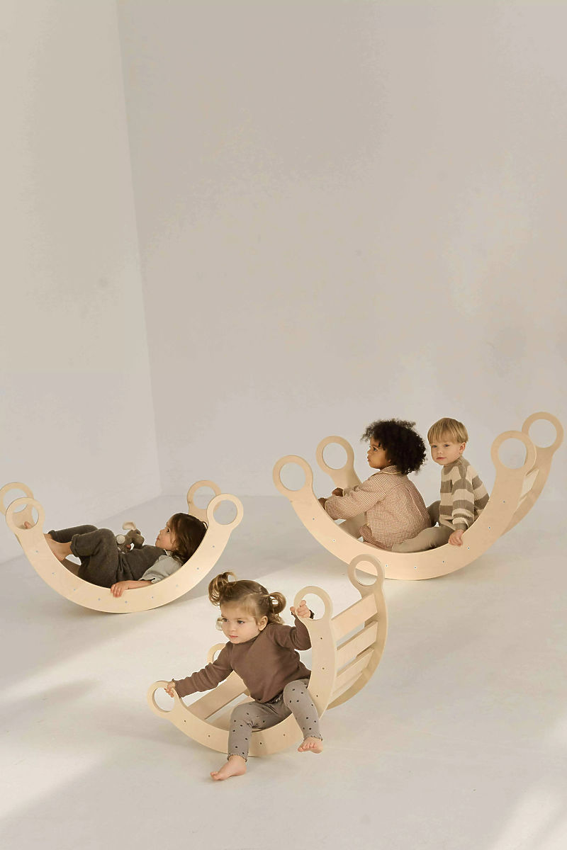Drewniana huśtawka Montessori z drabinką i zjeżdżalnią wspiera rozwój dzieci. .. więcej