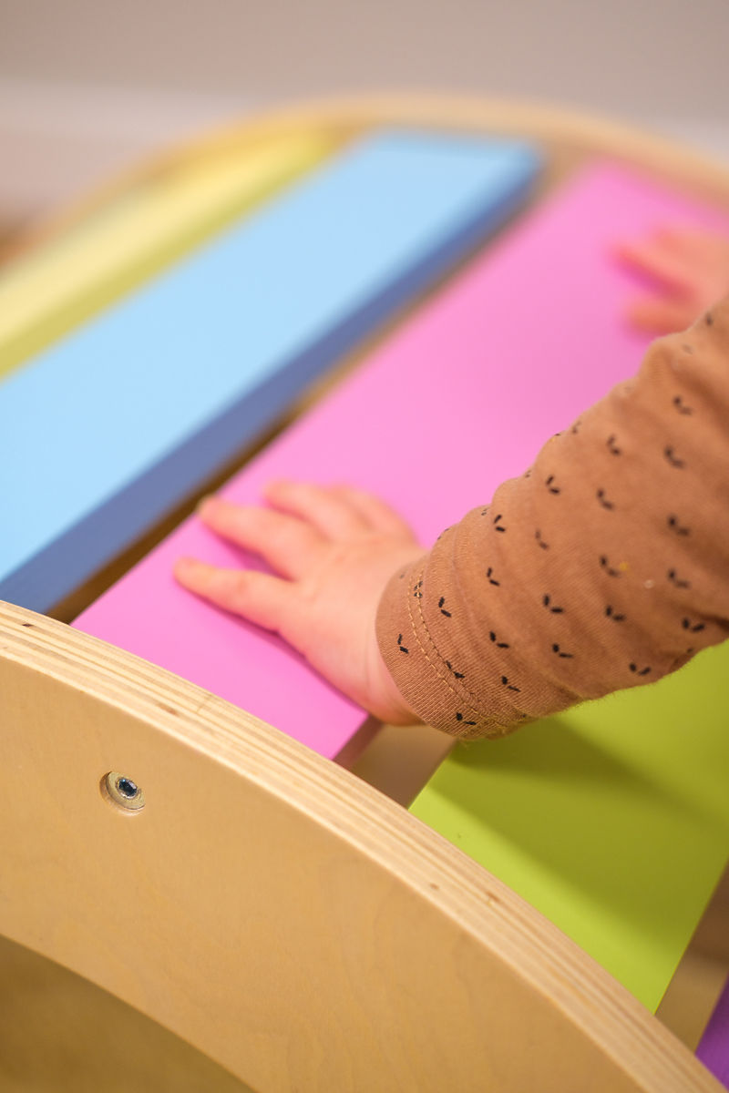 Ta niezwykła drewniana huśtawka Montessori ucieszy zarówno małe, jak i większe dzieci. Huśtawka ma wszechstronne zastosowanie i tylko od wyobraźni zależy, jak ją wykorzystasz. Może zamienić się w plac zabaw, ladę zabawkową, zjeżdżalnię, most, tunel i inne. Huśtawka wspomaga prawidłową postawę, koordynację, pobudza zmysły i rozbudza wyobraźnię dzieci .
