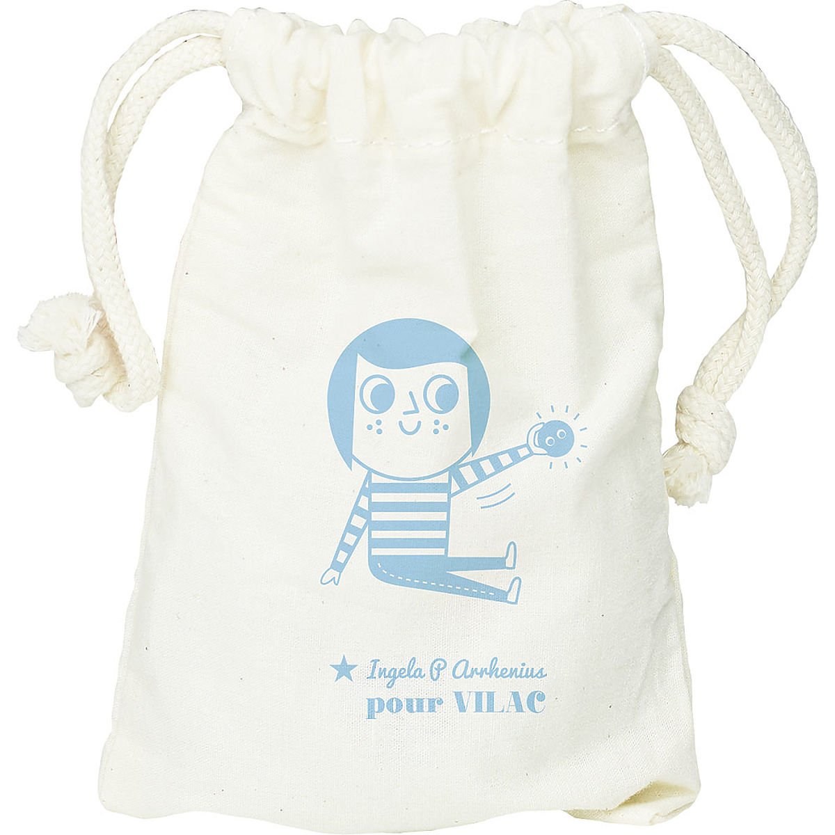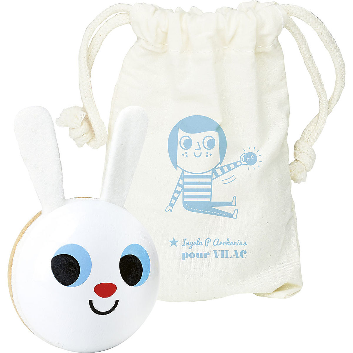 Uroczy króliczek jako grzechotka – marakas. Ilustracje Ingela P. Arrhenius. Wykonany z drewna i filcu we Francji. Średnica 8 cm. Główne cechy: wyprodukowany we Francji, projekt Ingela P. Arrhenius. Szwedzka artystka Ingela Peterson Arrhenius urodziła się w 1967 roku. Sztuka i design zawsze miały miejsce w jej życiu, a zanim rozpoczęła karierę ilustratorki, Ingela pracowała jako dyrektor artystyczny w Sztokholmie. Następnie studiowała reklamę i projektowanie graficzne w szkole artystycznej również w Sztokholmie. W 1992 roku zaczęła pracować jako niezależna ilustratorka i działała międzynarodowo w reklamie, projektowaniu, wydawnictwach… W przeszłości tworzyła wzory drukowane na tkaniny, tapety, artykuły papiernicze, pracowała także nad opakowaniami, projektowaniem produktów, dodatkami do wnętrz i zabawkami. Jej plakaty i designerskie zabawki można znaleźć na całym świecie. Ma pasję do stylu retro, co wyraźnie widać w jej pracach, a także w jej entuzjazmie do typografii i kolorów. Obecnie mieszka w Sztokholmie z mężem i dwoma synami.
