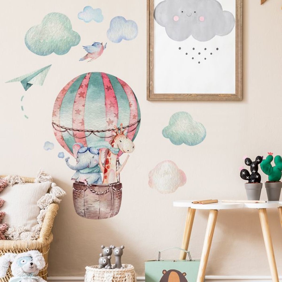 Piękna naklejka z motywem balonu na ogrzane powietrze, w której siedzą słonik i żyrafa. Naklejka utrzymana jest w jasnych, pastelowych kolorach. Ożyw swój pokój dziecięcy uroczymi dekoracjami ściennymi. Masz w rękach układ części na ścianie. Jeśli chcesz się dobrze bawić, zaangażuj swoje dzieci w dekorowanie.