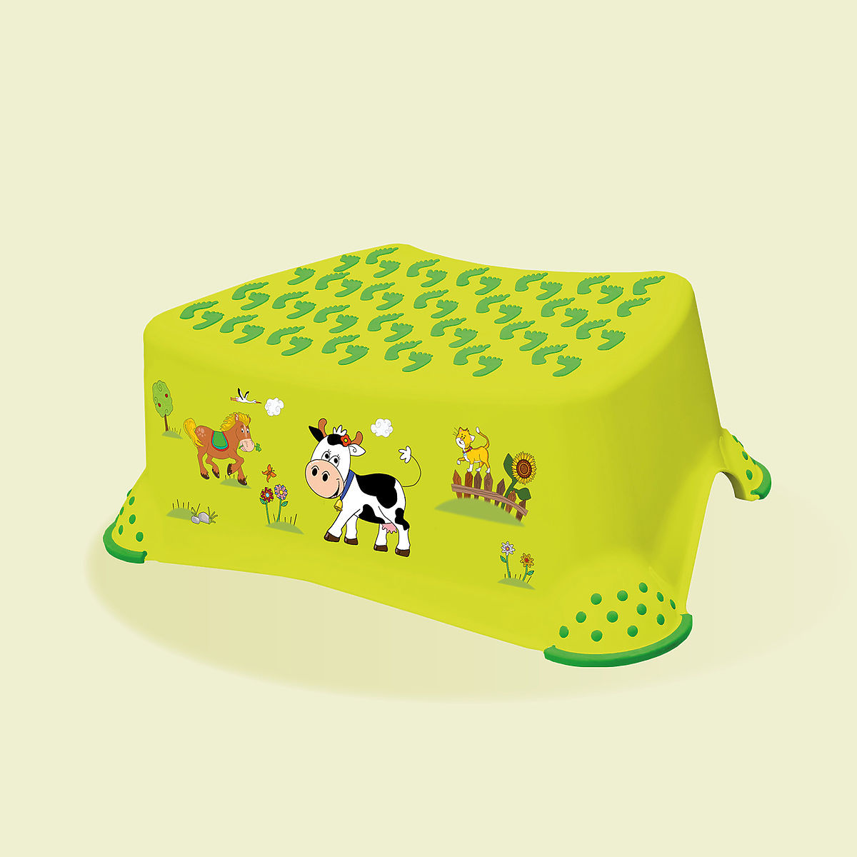 Podnóżek z antypoślizgowymi obrzeżami zapewnia dziecku odpowiednie bezpieczeństwo i chroni przed przesuwaniem się w trakcie użytkowania. Podnóżek to praktyczny pomocnik w nauce właściwych nawyków higienicznych.