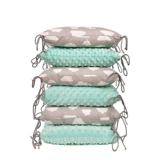 Ochraniacz z poduszek T-TOMI składa się z 6 pojedynczych części o wymiarach 35x35 cm wykonanych w 100% z bawełny oraz miękkiego, ciepłego i luksusowego materiału MINKY (3 + 3).
