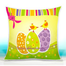 Poduszka z motywem wielkanocnym jest piękna, kolorowa i nowoczesna, drukowana tylko na jednej stronie. Poduszka jest z tylnej strony biała.