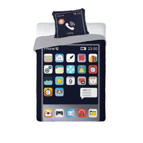 W skład pościeli wchodzi poszwa na kołdrę 140 x 200 cm oraz poszewka na poduszkę 70 x 90 cm . Powłoki są dwustronne . Przód to wyświetlacz telefonu z różnymi ikonami, a tył jest szary. Pokrowce wyposażone są w praktyczny zamek błyskawiczny , który umożliwia szybką zmianę pokrowca.