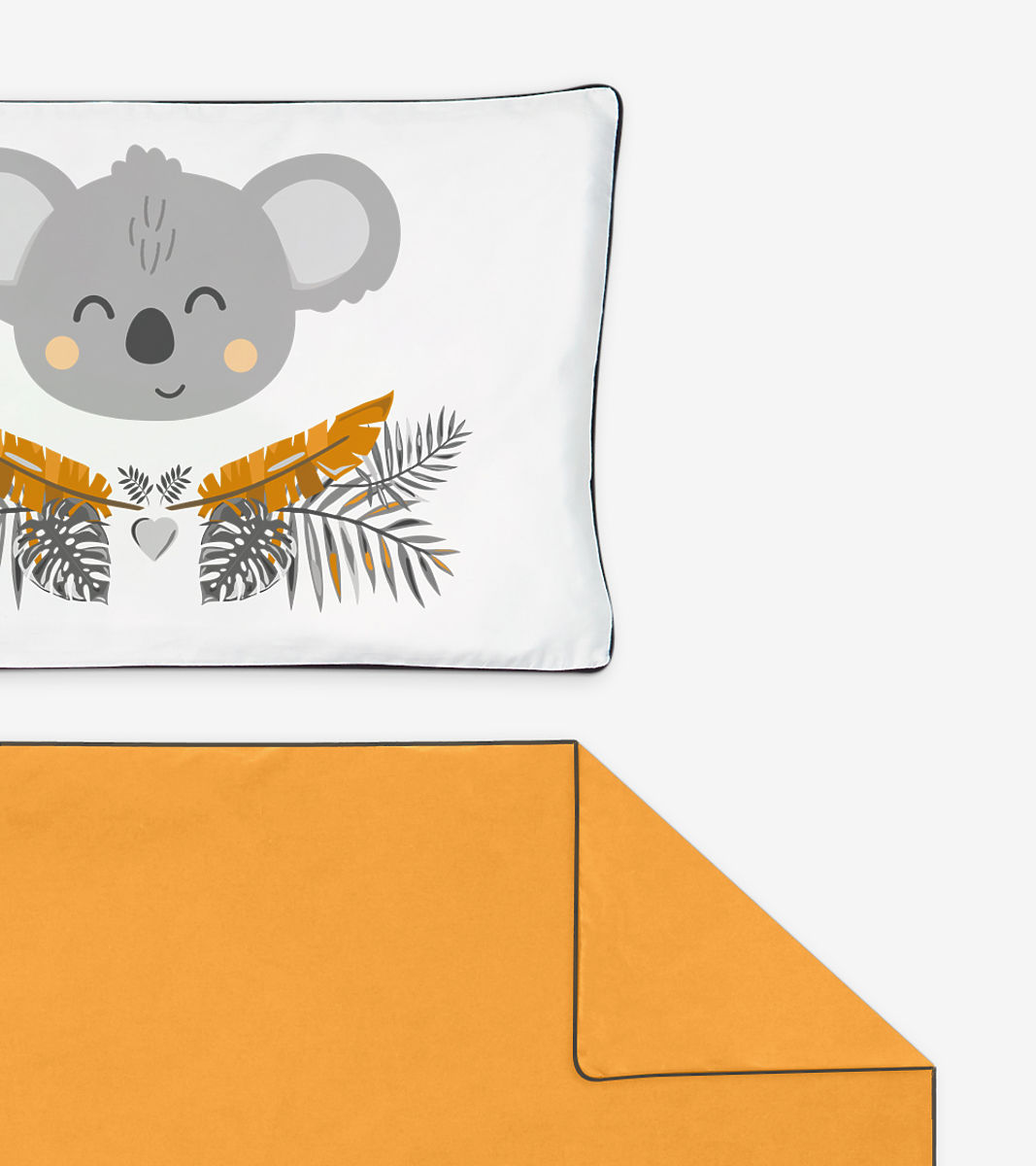 Pościel składa się z poszwy na kołdrę 135x100 cm i poszewki na poduszkę 40x60 cm . Poszewka na poduszkę jest dwustronna , gdzie jedna strona poszewki wykonana jest z satyny bawełnianej z motywem koali, a druga strona to gładka, musztardowa tkanina. Nadruk na tkaninie wykonany jest w sposób ekologiczny i bezpieczny dla dzieci . Pokrowce zapinane są na praktyczny i bezpieczny zamek błyskawiczny , który ułatwia szybką zmianę pokrowca.