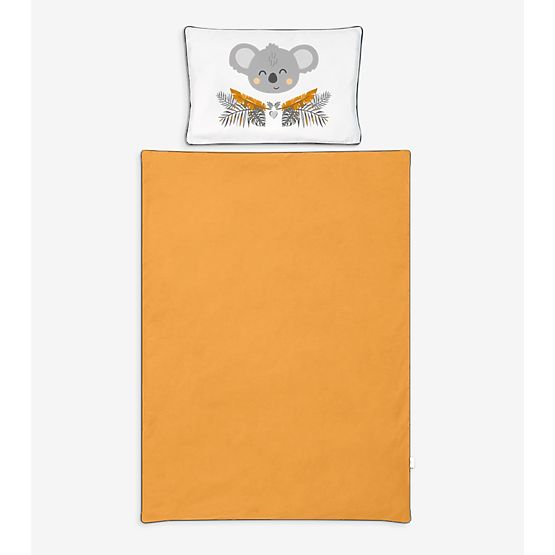 Dzięki bawełnianej pościeli dziecięcej Nature&Love Tropics z pięknym motywem koali i liści na poduszce w połączeniu z musztardowym kocykiem dziecięce sny będą o wiele słodsze.