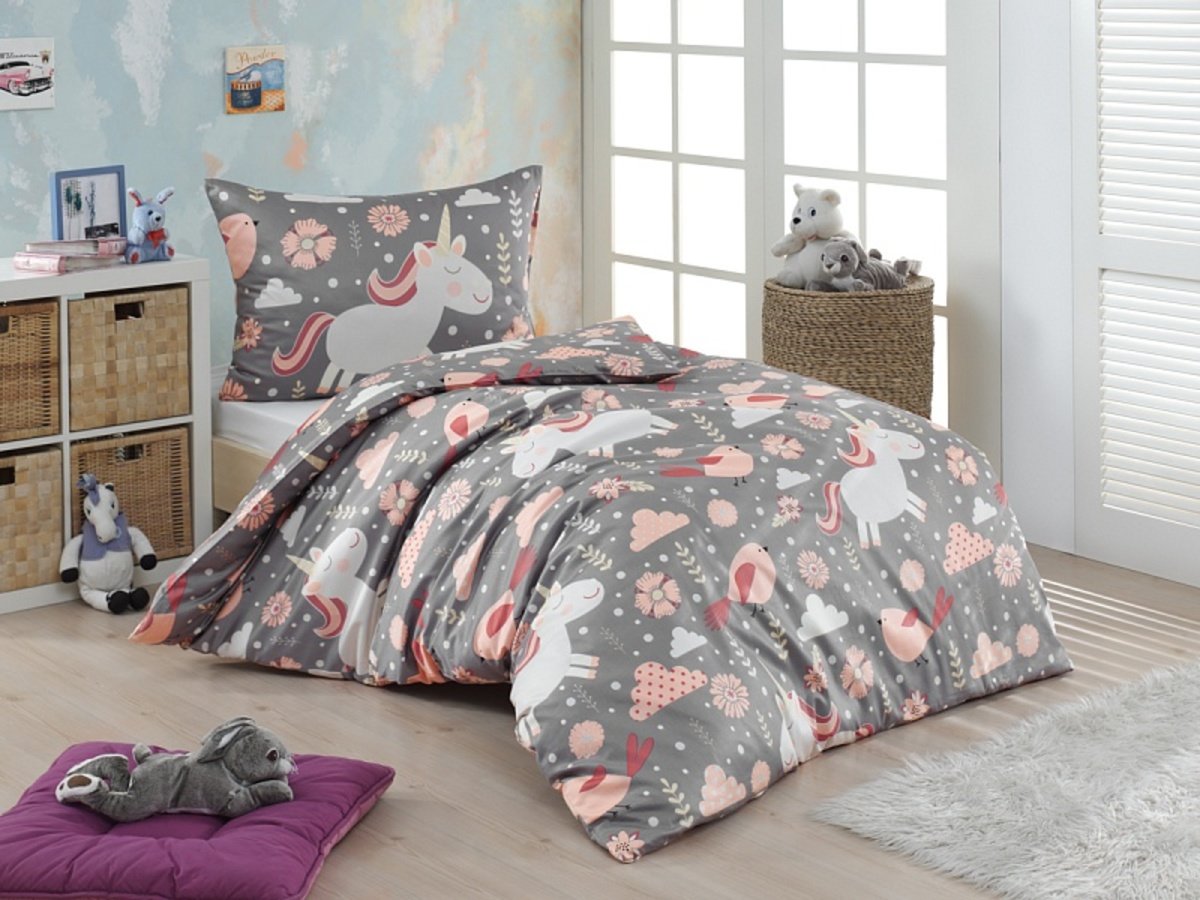 Mięciutka pościel LILY zapewni bajkowe sny każdej małej księżniczce. W delikatnych pastelowych kolorach dominują odcienie jasnego różu, ciemnej maliny, kremowej szarości i bieli. Popularny motyw mitycznych jednorożców uzupełniają ilustracje chmur, kwiatów i uroczych ptaków.