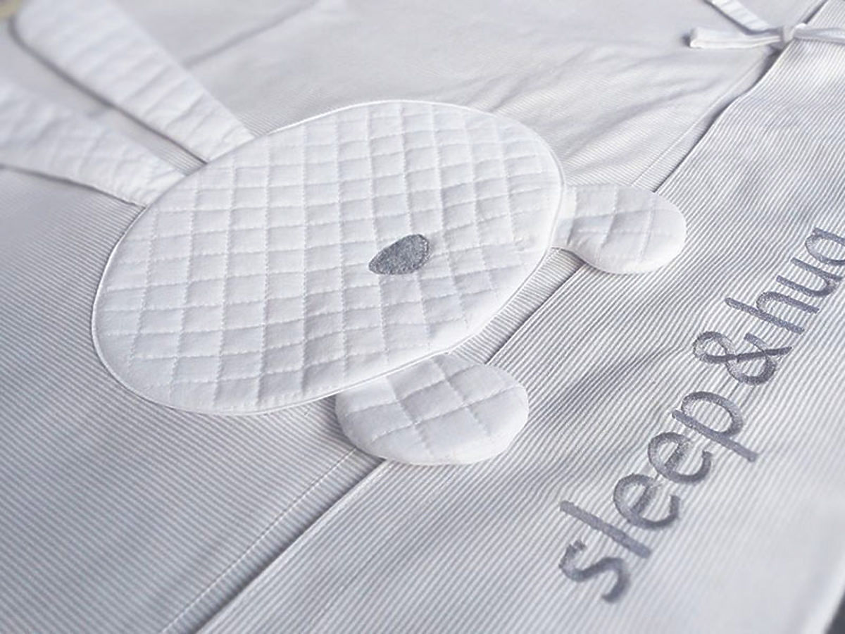 Milusia kolekcja z pięknym króliczkiem, który będzie pilnować każdego dzidziusia podczas snu. Dzieci będą uwielbiać tą pościel, odstające uszka będą ulubioną zabawką w łóżeczku. Mięciutki szary nosek podkreśla lekki kolor pościelli. Kokardki w środku pościeli są nie tylko ozdobą, ale również praktyczną częścią. Wypełnienie wkłada się w środku, chroni tak przed wypadaniem kołderki.