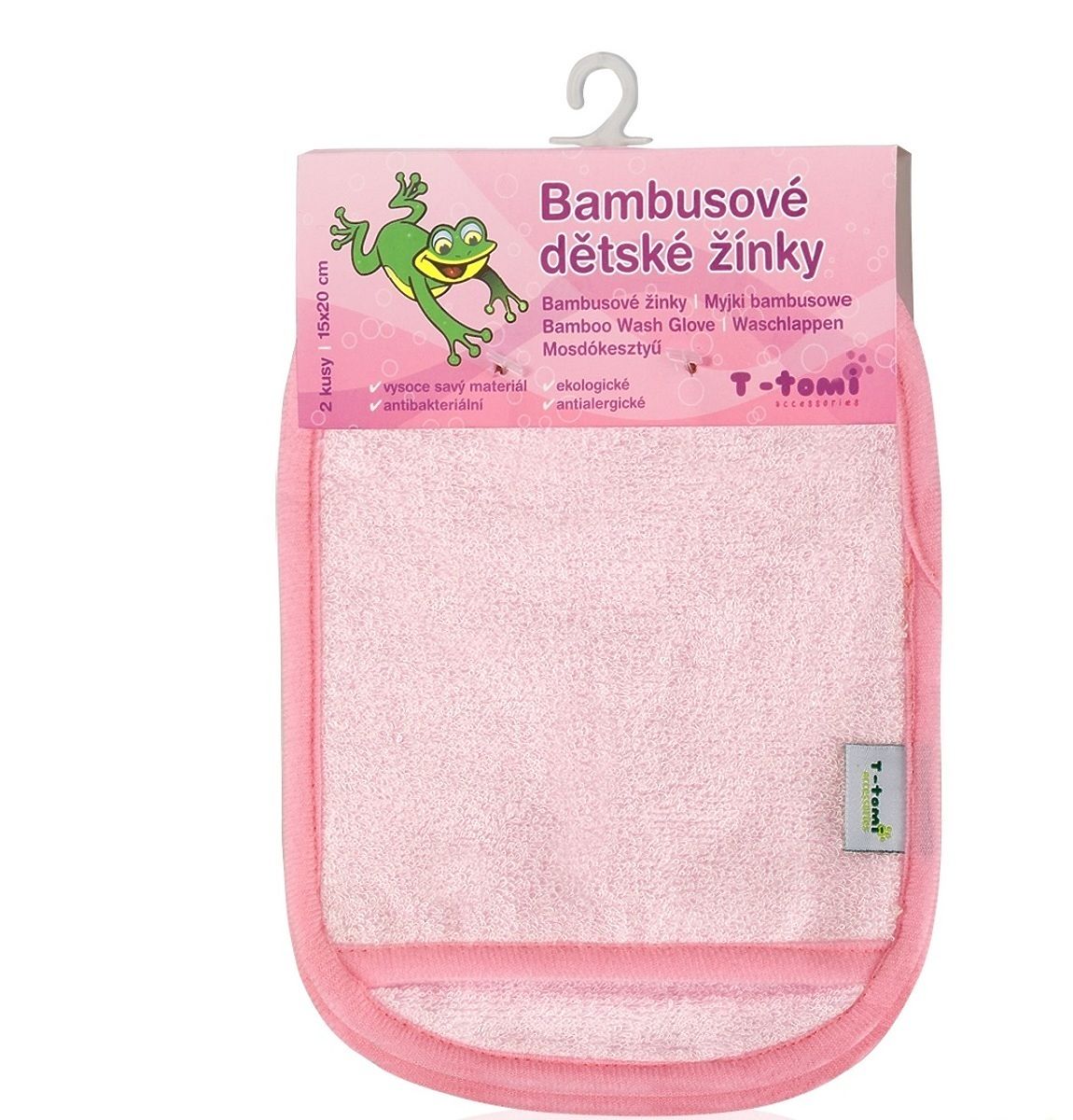 Szmatka marki T-tomi wykonana jest z tkaniny frotte z materiału bambusowego, który jest dla skóry dziecka łagodny i przyjazny. Materiał ten jest również bardzo chłonny. Ręczniczki mogą być używane klasycznie podczas mycia dziecka, jednak mogą być używane do wycierania dziecka, masażu i tak dalej. Zestaw zawiera 2 szmatki wykonane jako rękawice.