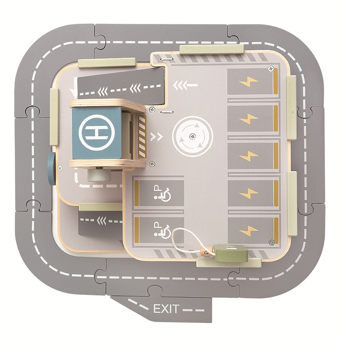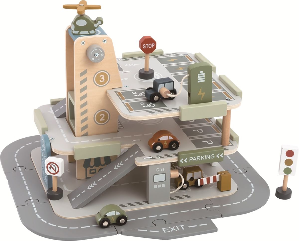 Wszystkim miłośnikom motoryzacji zaświecą się oczy, gdy zobaczą garaż z drogą, windą i lądowiskiem dla helikopterów. Umieść znaki drogowe, przygotuj swoje samochodziki i zabawa może się rozpocząć. Umyj swój pojazd w myjni samochodowej. Zatankuj paliwo przy dystrybutorze na parterze. Masz samochód elektryczny? Żaden problem, wjedź swoim pojazdem windą i podłącz go do ładowarki na drugim piętrze. Bateria pełna? Możesz ruszać. Wypadek? Z lądowiska na dachu już startuje helikopter. Ta edukacyjna zabawka motywuje dzieci do kreatywnej i wyobraźniowej zabawy. Rozwija koordynację ręka-oko, małą motorykę i zręczność. Garaż z parkingami na trzech poziomach zawiera również drogę, 4 samochodziki, helikopter i 3 znaki drogowe. Główne cechy: 3 piętra, garaż z drogą, lądowiskiem i windą, 4 samochodziki, myjnia samochodowa, 2 dystrybutory paliwa (w tym 1 elektryczny), helikopter, 3 znaki drogowe, inspiruje do kreatywnej i wyobraźniowej zabawy, rozwija koordynację ręka-oko, małą motorykę i zręczność, odpowiednie dla dzieci od 3 lat