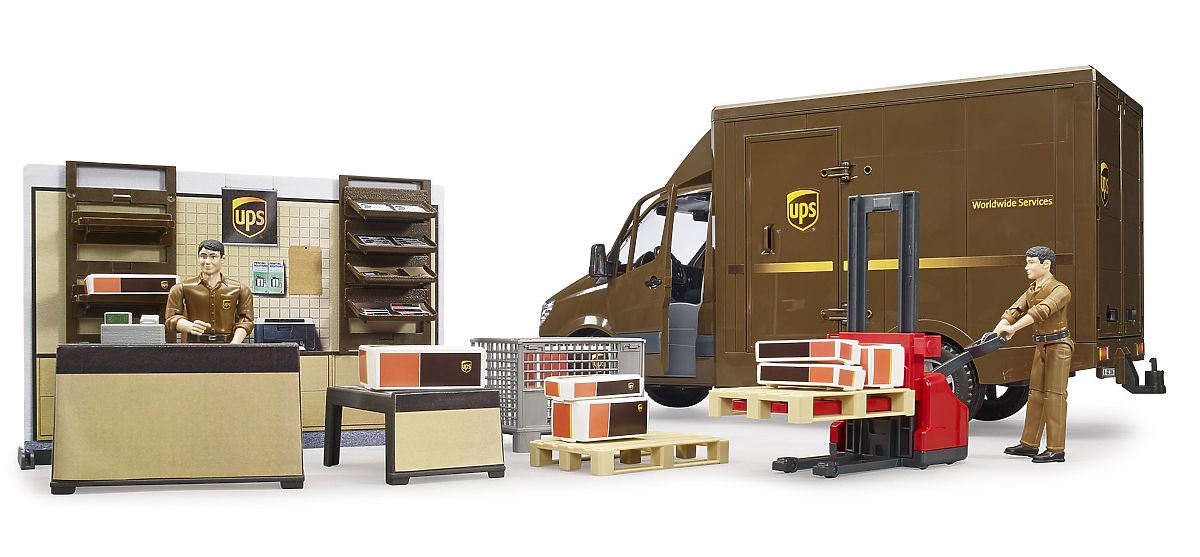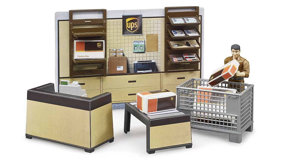 Punkt odbioru UPS od firmy BRUDER z wyposażeniem i figurką. Możesz odbierać i nadawać przesyłki, kupować pudełka transportowe i korzystać z innych usług. .. więcej