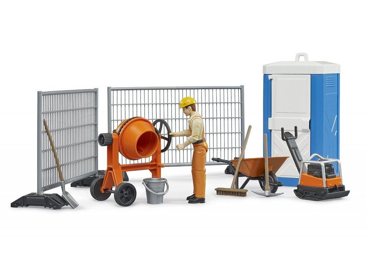 Ten tematyczny zestaw pozwala małym budowniczym realistycznie odtworzyć różnorodne sceny na placu budowy. Ogrodzenia budowlane zabezpieczają teren budowy. W zestawie znajduje się również płyta wibracyjna i betoniarka do prac budowlanych. Oczywiście, w zestawie jest także przenośna toaleta dla osobistych potrzeb pracownika budowlanego. Zestaw budowlany bworld jest szczególnie odpowiedni jako rozszerzenie do pojazdu MB Sprinter (Bruder 2677), minikoparki Cat (Bruder 2466) lub traktora z ładowaczem czołowym JCB MIDI (Bruder 2427). Główne cechy: skala: 1:16 wysokość figurki: 10,7 cm wysokiej jakości i szczegółowe wykonanie wyprodukowano w Niemczech