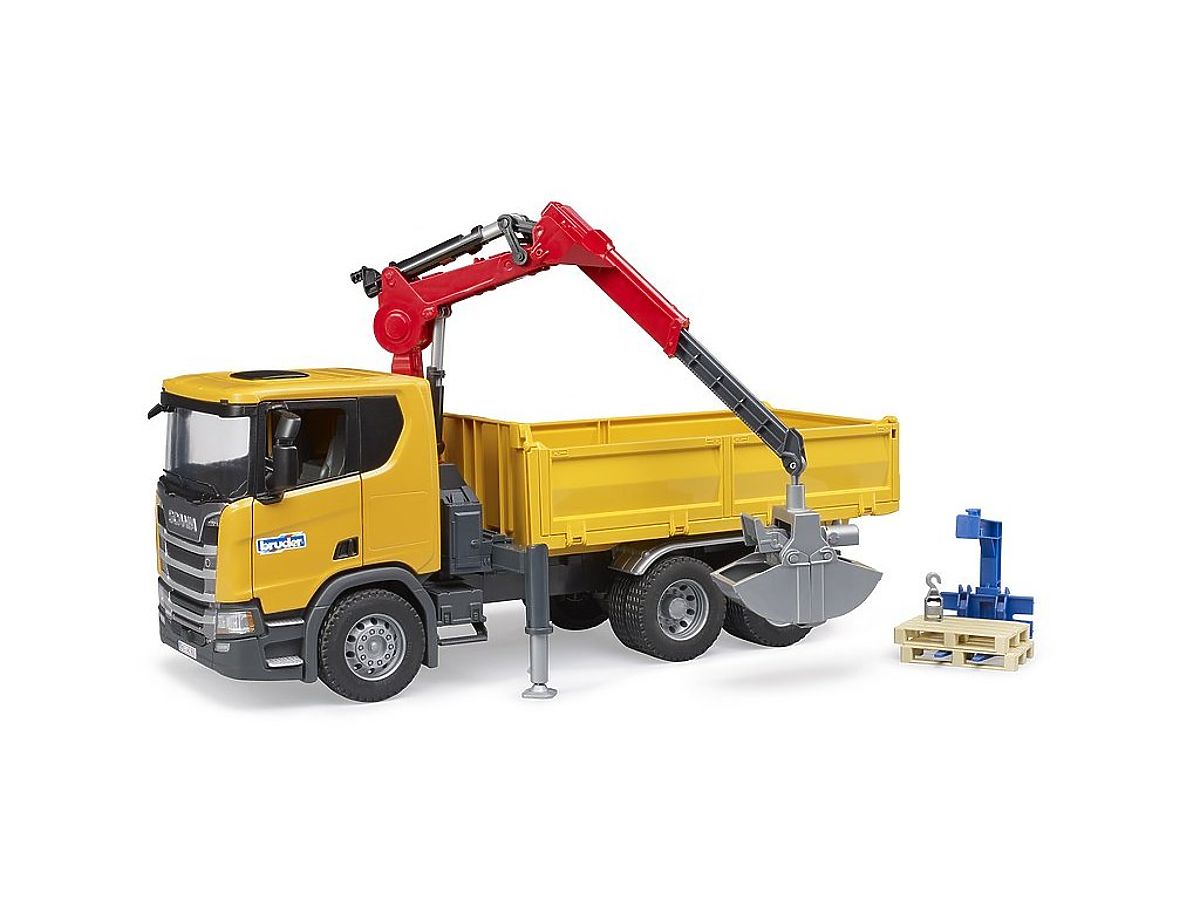 Podobnie jak inne modele Scania, ten również charakteryzuje się wytrzymałością i solidnością. Ciężarówka ma otwierane drzwi, składane lusterka i nadaje się do zabawy w domu i w terenie. Przednia kabina tego pojazdu zapewnia komfortowe miejsce pracy dla wszystkich figurek ze świata bworld. Za kabiną znajduje się teleskopowe ramię ładunkowe obracające się o 360 stopni. Dla łatwiejszego załadunku i rozładunku służą składane burty i platforma ładunkowa. Stabilność pojazdu zapewniają podpory. W zestawie znajdują się dwie palety, widły paletowe i chwytak z łopatą. Główne cechy: składane lusterka, otwierane drzwi, ramię obracające się o 360°, składane burty, podpory, składana platforma, nadaje się do zabawy w domu i na zewnątrz, kompatybilne z figurkami BRUDER bworld, wyprodukowane w Niemczech, odpowiednie od 4 lat