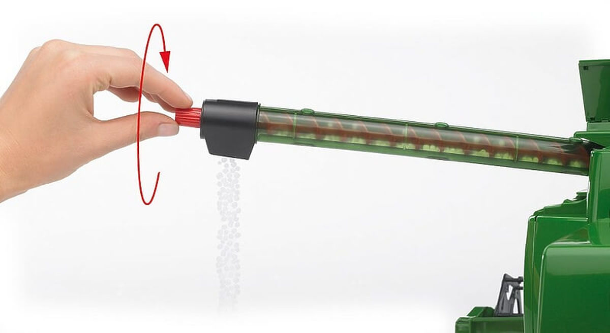 Ten kombajn Bruder posiada wiele funkcjonalnych elementów, takich jak otwierane drzwi, składane lusterka, obrotowe schody do kabiny kombajnu, obrotową listwę tnącą, skrętne tylne koła, składane górne i boczne pokrywy, składane ramię. Ślimak w ramieniu imituje wysypywanie zboża. Materiał jest odpowiedni do zabawy w domu i na zewnątrz. Wyprodukowano w Niemczech. Główne cechy: wiele funkcjonalnych elementówodpowiedni do zabawy w domu i na zewnątrzwyprodukowano w Niemczech