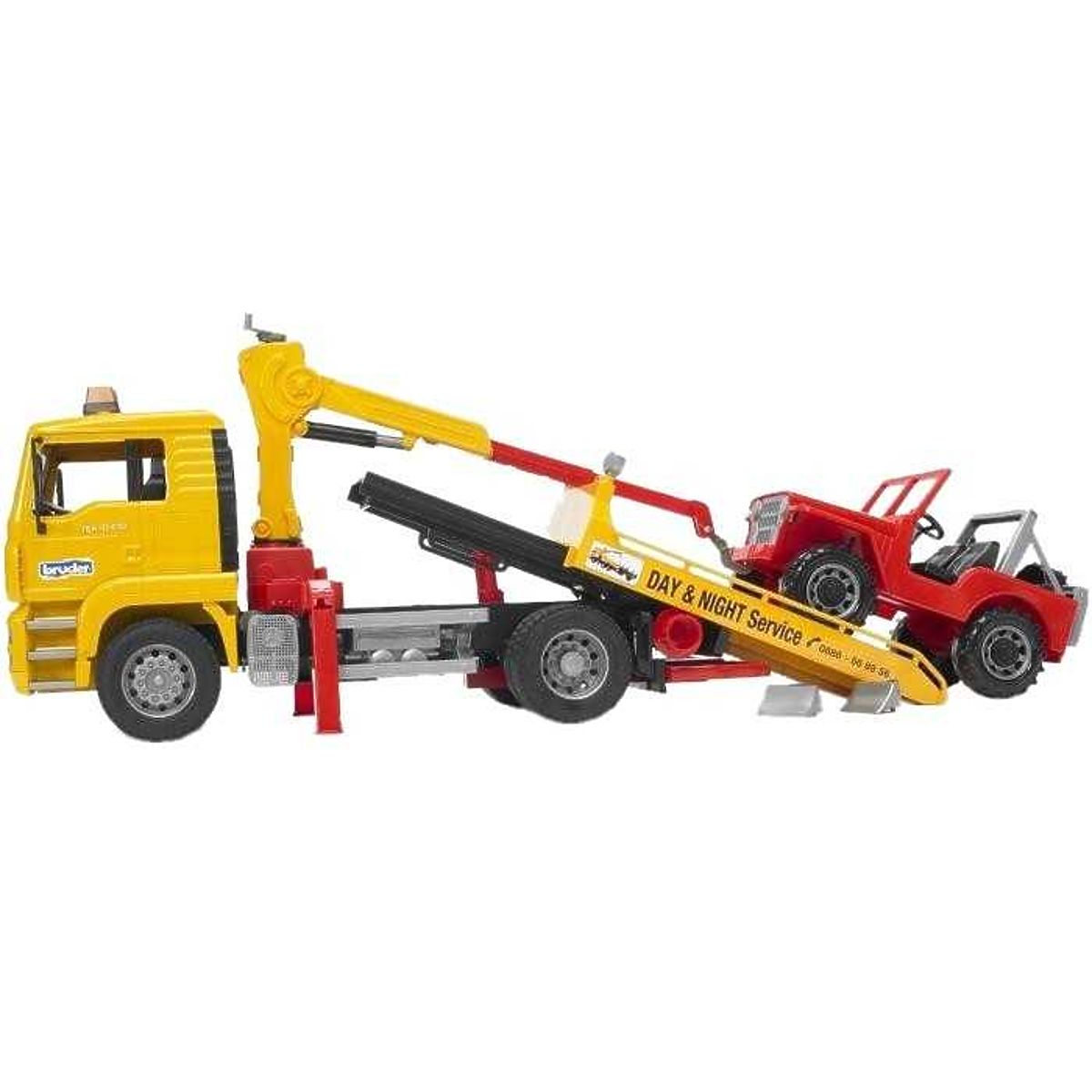 Bruder Samochód ciężarowy MAN holownik + JeepHolownik + Jeep to samochód holowniczy z jeepem. Holownik MAN TGA ma odchylaną kabinę, można zajrzeć do bloku .. więcej
