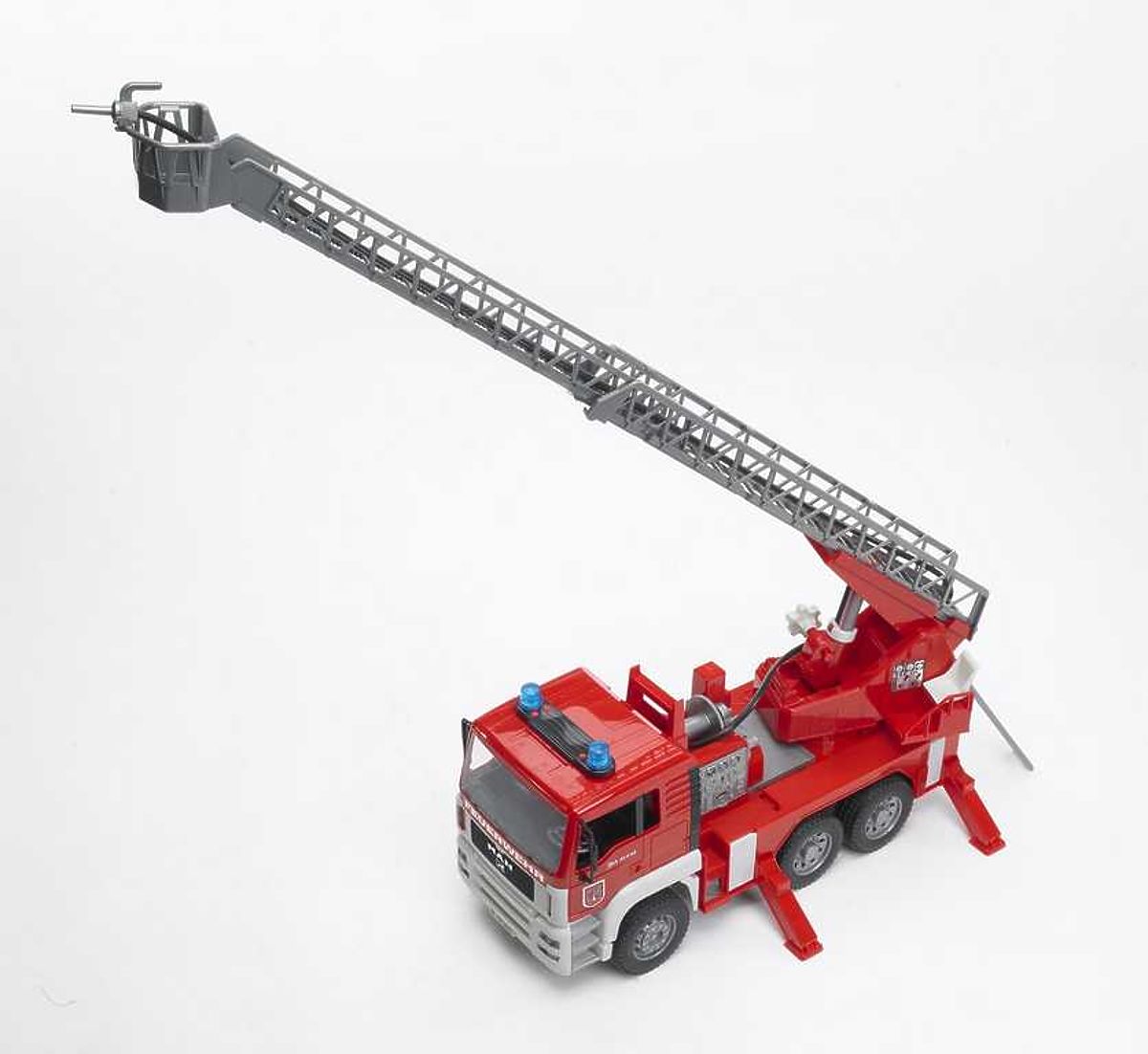 Bruder MAN TGA Straż Pożarna z pompą to szczegółowy model pojazdu z solidnymi profilowanymi oponami, posiada w pełni odchylaną kabinę, umożliwiającą wgląd w blok silnika, jest wyposażony w w pełni funkcjonalną pompę wodną i sikawkę, a przede wszystkim w duży, wysuwany drabinę. Ramię drabiny można wysunąć na długość aż 80 cm! Platforma z wysuwaną drabiną jest obrotowa, lusterka przy kabinie można złożyć, a zintegrowany zbiornik na wodę łatwo napełnić. Cztery podpory zapewniają doskonałą stabilność całego pojazdu nawet z wysuniętą drabiną. Ciekawostką w tym pojeździe jest nowoczesny moduł wielofunkcyjny ze światłem i dźwiękiem. Wyprodukowano w Niemczech, z wysokiej jakości materiałów. Główne cechy: w pełni odchylana kabina, w pełni funkcjonalna pompa wodna i sikawka, duża wysuwana drabina o długości do 80 cm, obrotowa platforma z wysuwaną drabiną, składane lusterka, nowoczesny moduł wielofunkcyjny ze światłem i dźwiękiem, wyprodukowano w Niemczech