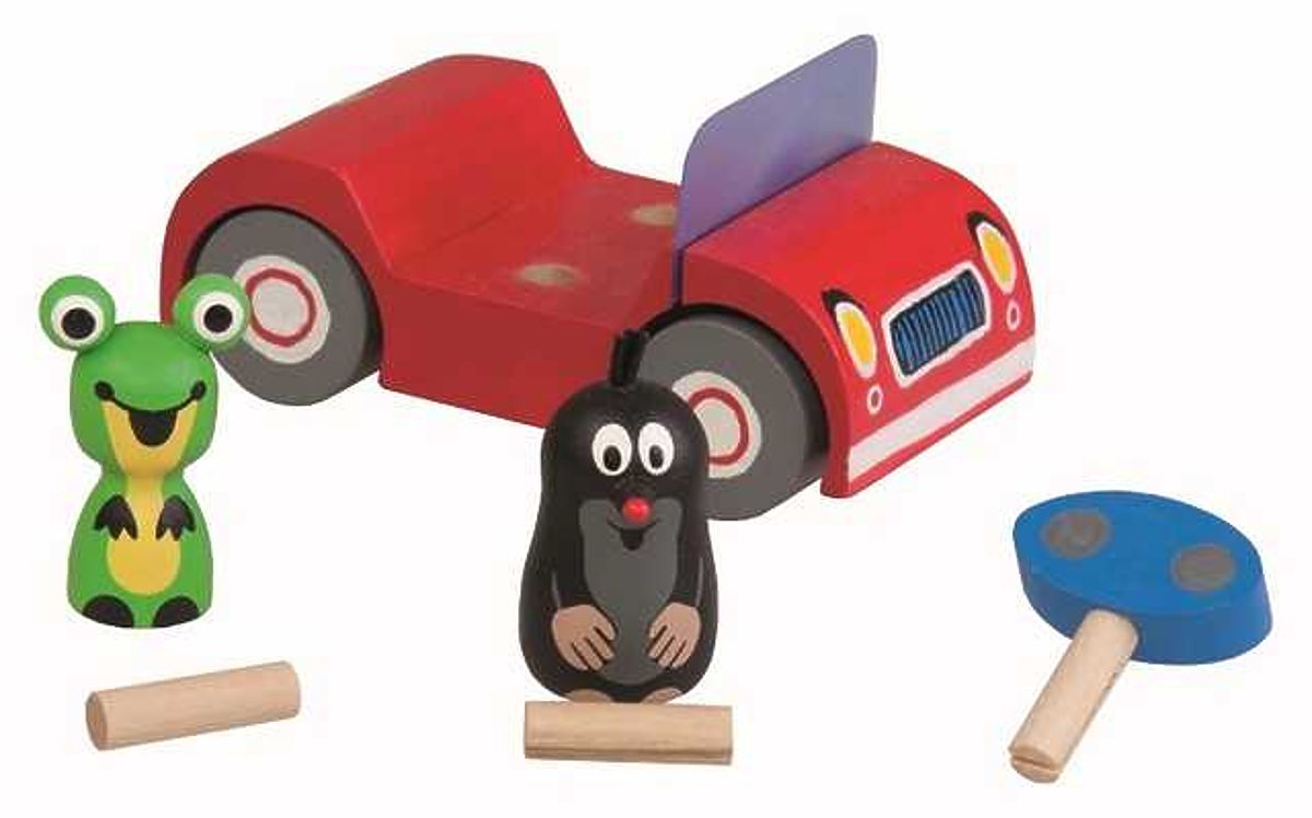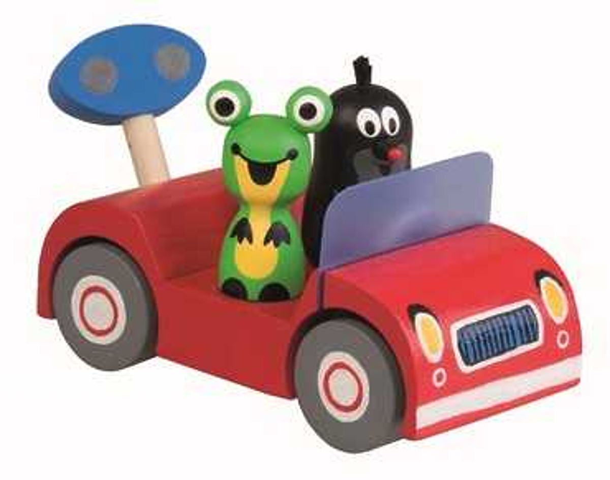 Krecik z przyjaciółką Żabką w czerwonym samochodziku na wycieczce. Figurki i kluczyk można dowolnie wyjmować i zamieniać. Główne cechy: produkt spełnia wymagania UE dotyczące bezpieczeństwa zabawek, odpowiedni dla dzieci od 3 lat © Zdeněk Miler