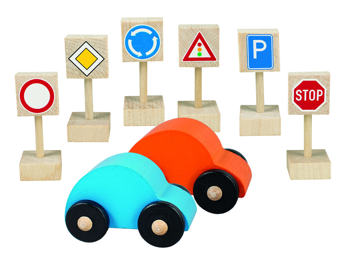 Zawiera: 2 drewniane samochodziki, 6 znaków drogowych