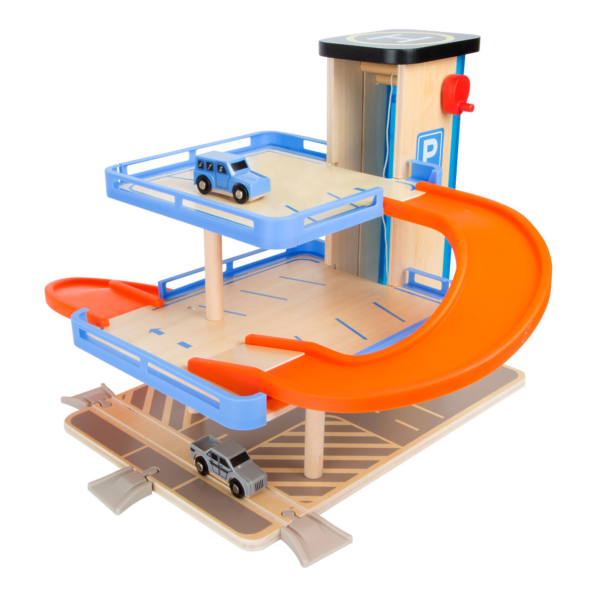 Przestronny garaż w atrakcyjnych kolorach oferuje trzy poziomy połączone windą i płynnie łączącymi się rampami. W zestawie znajdują się dwa samochodziki, dzięki czemu dzieci mogą się bawić zaraz po złożeniu. Podstawowe elementy z grubej sklejki i litego drewna uzupełniają solidne plastikowe części, co sprawia, że zabawka jest szczególnie trwała i oferuje długą żywotność. Można ją rozbudować o wiele akcesoriów i jest w pełni kompatybilna z kolejkami innych dużych producentów. Produkt wymaga montażu, dostarczany z ilustrowaną instrukcją montażu. Główne cechy: garaż i 2 samochodziki, 3 poziomy, 2 rampy i funkcjonalna winda, solidna i trwała konstrukcja, kompatybilna również z kolejkami innych producentów.