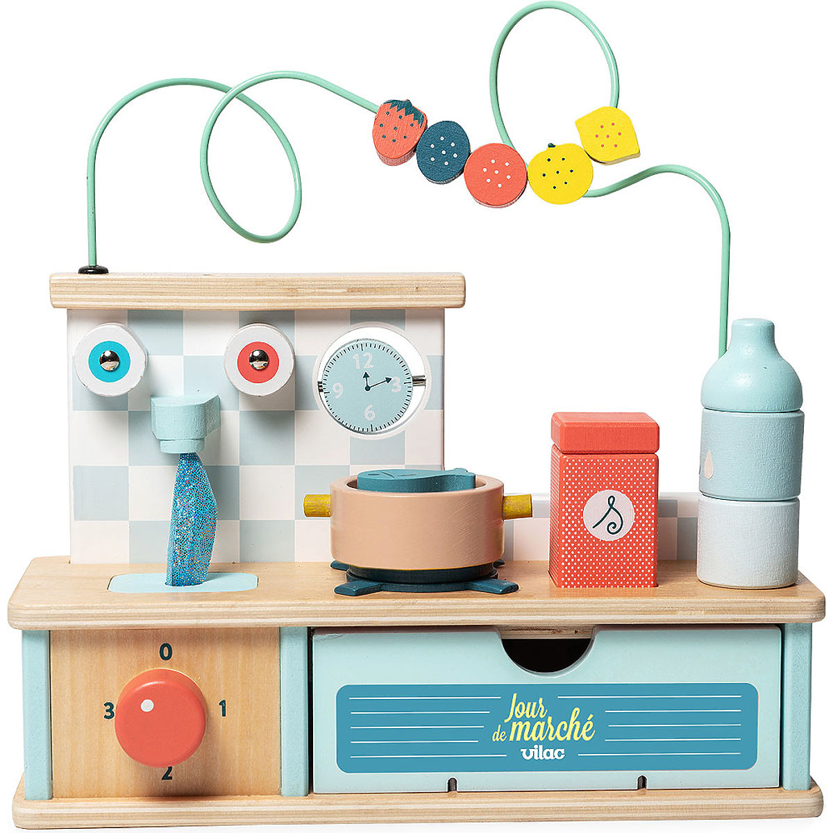 Ta drewniana wielofunkcyjna kuchnia motoryczna jest przeznaczona dla najmłodszych i oferuje mnóstwo niespodzianek oraz różnorodnych aktywności! Labirynt z owocami, obracający się zegar, układaną butelkę i solniczkę. Umieść ryby w garnku i gotuj je jak dorośli. Następnie otwórz drzwiczki piekarnika, aby włożyć ciasta, obróć pokrętło, aby rozpocząć pieczenie. Hmmm, pachnie tak dobrze! Jeśli chcesz umyć naczynia, wystarczy otworzyć kran. Ta kuchnia motoryczna została zaprojektowana przez zespół specjalistów firmy Vilac dla rozwoju sensorycznego dzieci. Główne cechy: interaktywne elementy motoryczne, klikające pokrętła, otwierany piekarnik, odpowiednia dla dzieci od 18 miesięcy, dla rozwoju sensorycznego dzieci.
