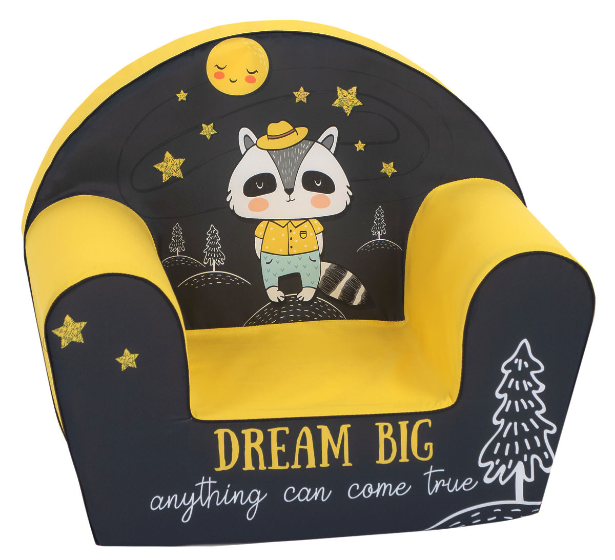 Czarno-żółty fotelik z motywem uroczego szopa w nocnym lesie. Na foteliku znajduje się napis DREAM BIG anything can come true. Dziecięcy fotelik wykonany jest z miękkiej i lekkiej pianki. Dzięki temu masz pewność, że jest bezpieczny i praktyczny do codziennego użytku.